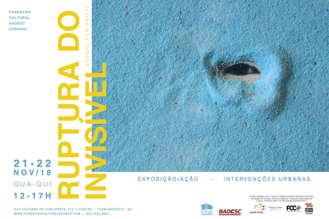 O artista Sérgio Adriano H. fará intervenções urbanas no muro externo da Fundação Cultural Badesc, em Florianópolis, nos dias 21 e 22 de novembro. A Exposição/Ação Ruptura do Invisível poderá ser acompanhada pelo público das 12 às 17h. A curadoria da intervenção é de Fabiana Lopes.