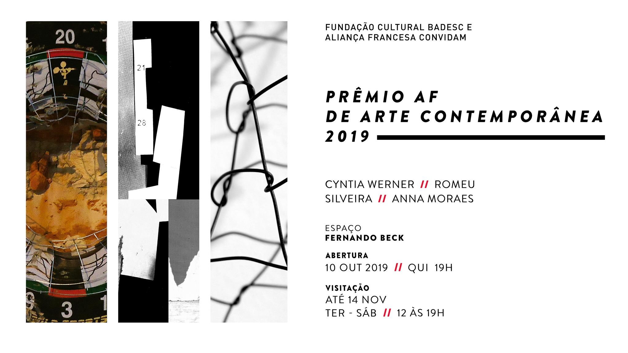 Uma das instituições culturais mais importantes de Santa Catarina, a Fundação Cultural Badesc recebe pela primeira vez uma exposição com os artistas selecionados na principal premiação do circuito de artes do Estado: o Prêmio AF de Arte Contemporânea. A mostra dos três finalistas da edição 2019 — Anna Moraes, Cyntia Werner e Romeu Silveira —abre no dia 10 de outubro. Na noite de abertura será anunciado o grande vencedor do prêmio: uma residência artística de três meses na Cité Internationale des Arts, em Paris.