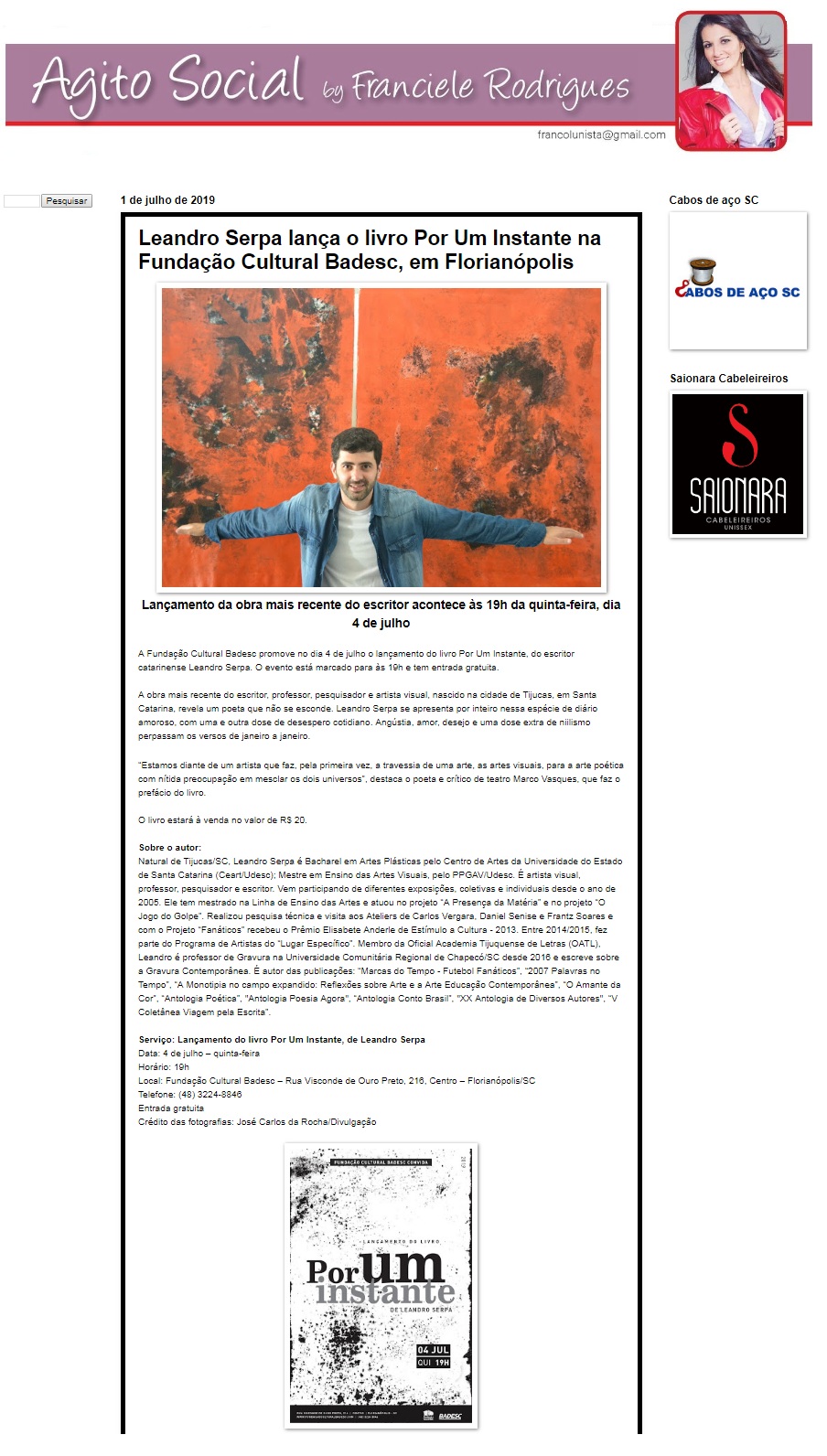 No dia 04 de julho, é realizado o lançamento do livro Por Um Instante, de Leandro Serpa. O evento é às 19h. A obra revela um poeta que não se esconde. Serpa se apresenta por inteiro nessa espécie de diário amoroso, com uma e outra dose de desespero cotidiano. Angústia, amor, desejo e uma dose extra de niilismo perpassam os versos de janeiro a janeiro.