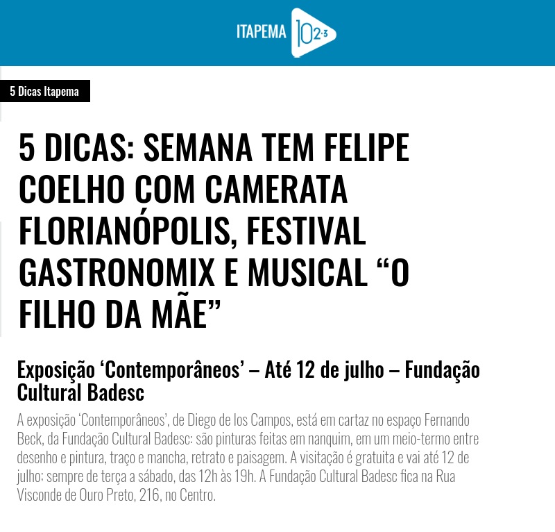 Entre as atividades culturais que ocorrem neste início de julho, o jornalista Edsoul destaca alguns eventos da programação da Fundação Cultural Badesc. Como destaque estão a 18ª Mostra de Cinema Infantil, que passa pela Fundação exibindo diversos curtas; o lançamento do livro Por um instante, de Leandro Serpa e a roda de conversa com a artista visual Sofia Brito. As informações foram divulgadas no jornal Hora de Santa Catarina e no site da NSC.