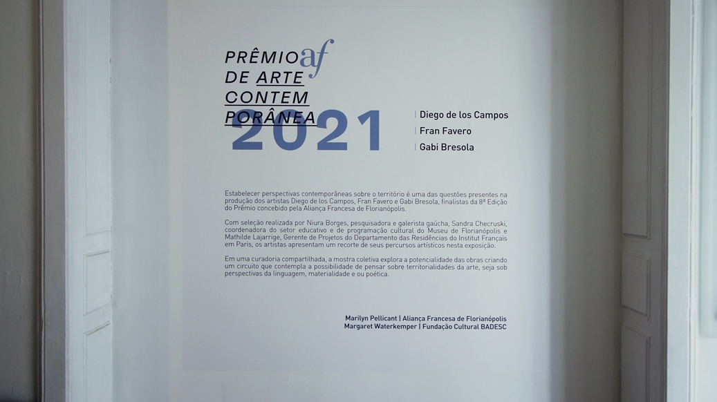 A 8ª Edição do Prêmio Aliança Francesa de Arte Contemporânea, de Florianópolis é realizada em parceria com a Fundação Cultural BADESC que organiza a mostra com obras dos três finalistas: Diego de los Campos, Fran Favero e Gabi Bresola. Os artistas foram selecionados por Mathilde Lajarrige, Niura Borges e Sandra Checruski. No dia da live de abertura, divulgou-se a atribuição do primeiro lugar que recebe como prêmio uma residência na Cité Internationale des Arts, em Paris.