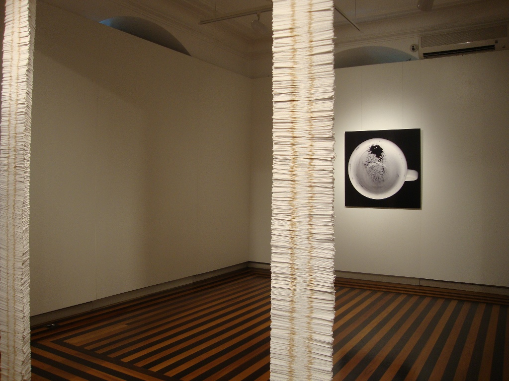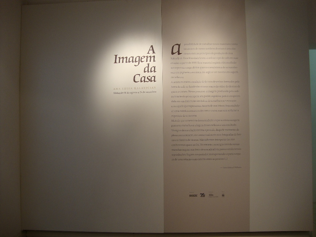 Exposição A imagem da Casa, de Ana Luiza Kalaydjian. A possibilidade de trabalhar novos materiais e texturas através de meios também diversos é uma das características principais da produção de Ana Kalaydjian. Essa liberdade levou-a a utilizar o pó de café em suas criações a partir de 1999. Esse material orgânico foi escolhido tanto por sua carga afetiva quanto camaleônica de se transformar em pigmento, em tinta, em argila e até mesmo em superfície refletora.