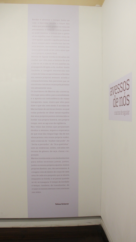 Bordar é afrontar o tempo. Junto ao colo, o bastidor recebe o toque das mãos que percorrem pontos no ritmo do pensamento: é ritmo de carícia, quando se pode mostrar a beleza que a gente vê no espelho; mas é também ritmo de contragolpe, quando a agulha perfura as dores amigas para transformá-las em seus avessos, necessários, avessos nos quais a gente pode se ver com o amor que nos é próprio, e ponto final.Marina de Aguiar borda os desafios da mulher que olha para a história da arte e não se vê, e não se vê nos padrões da propaganda dirigida a ela, mulher; borda também a coragem entretecida nos corpos de todas as que estamos refletidas em nossos próprios avessos: acorda o companheirismo das parceiras que se encontram com seus corpos pela primeira vez plenamente seus.