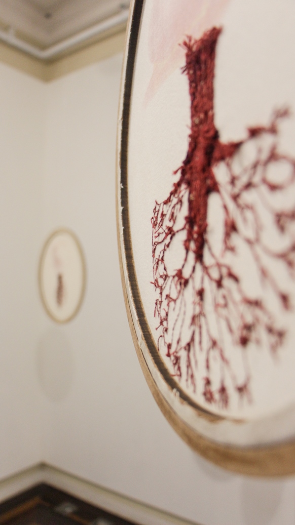 A figura do corpo feminino sempre apareceu muito em meus trabalhos, e, cada vez mais, o bordado me pareceu oportuno para falar dele: bordar, bordar-se, abordar-se, e finalmente, transbordar. Isso porque todo meio que usamos, tem a sua própria fala, sua própria expressão; tanto na sua materialidade – suas texturas, cores, formatos – como também no seu processo histórico. Usá-lo para falar do corpo feminino é contar uma história sobre as mulheres, suas expressões, opressões, e também suas resistências. Pesquisar essa história é desvendar o outro lado das histórias hegemônicas da arte; é se deparar com estruturas e hierarquias construídas para desmerecer, diminuir e, sobretudo, invisibilizar tudo o que as mulheres construíram através dos anos; é se dar conta de que a versão da história que conhecemos hoje pode, de um lado, parecer uma linha comportada e reta, e de outro, pode ser um emaranhado de fios e pontos soltos. Para toda história, existe um avesso. Ele habita os silêncios, as pausas, os livros que nunca foram escritos. As narrativas dos lados de fora da biblioteca e nos espaços vazios entre as prateleiras. Foi a partir daí, no desenrolar dessas histórias, me aventurando pelos avessos, que percebi que fazia pouco sentido a idéia de um uso artístico de um meio artesanal; que não me bastaria buscar artistas contemporâneas que trabalhassem com técnicas têxteis, ou determinar o uso “artístico” dessas técnicas. Busquei ao invés disso questionar, afinal, o que essa fronteira entre artesanal e artístico realmente significa, e quais as construções por trás dessa divisória que naturalizamos.