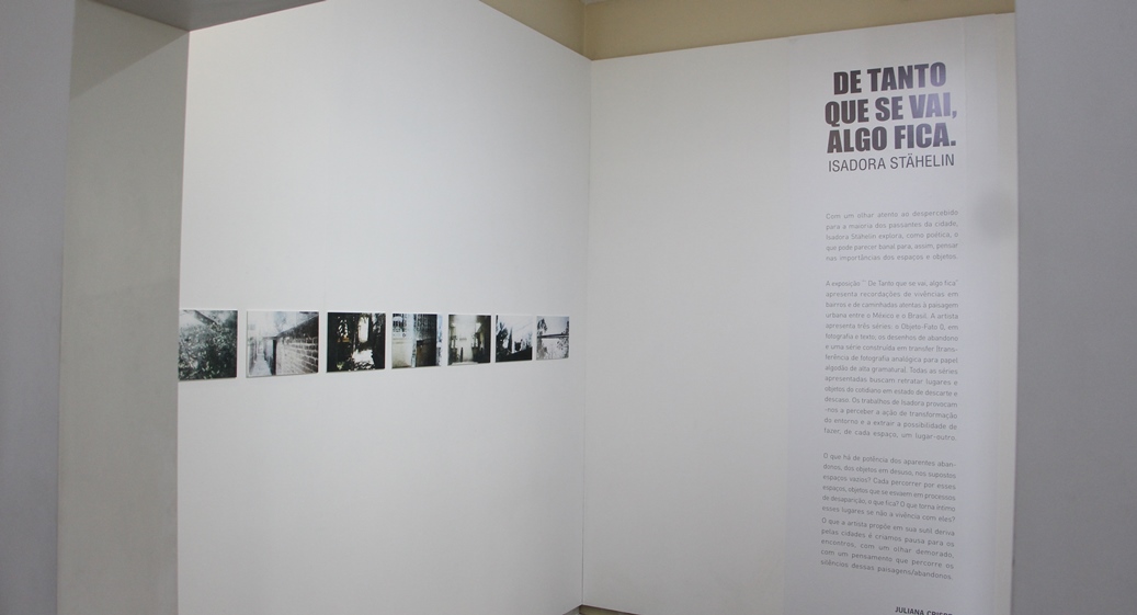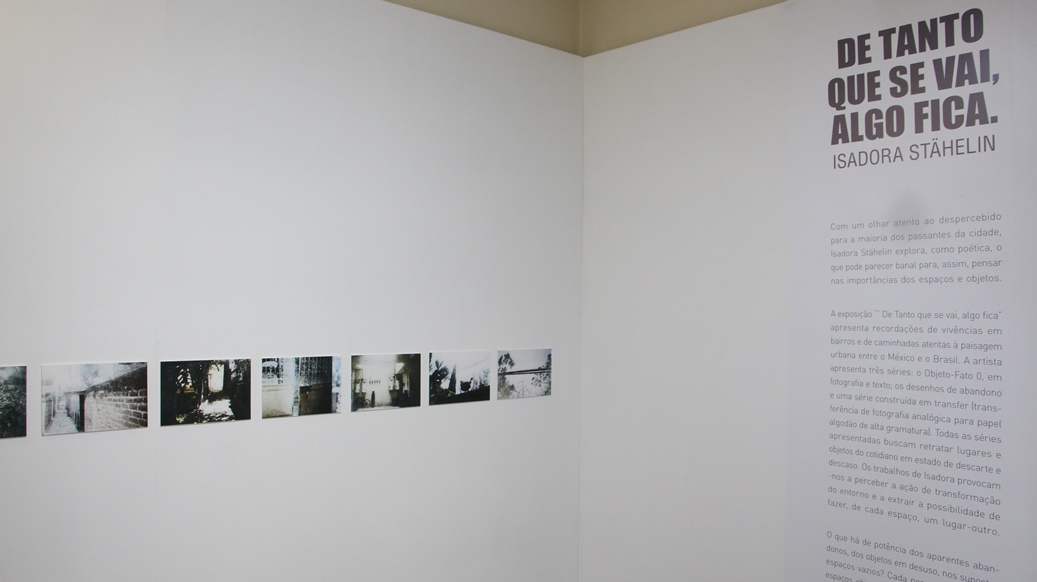 Com um olhar atento ao despercebido para a maioria dos passantes da cidade, Isadora Stähelin explora, como poética, o que pode parecer banal para, assim, pensar nas importâncias dos espaços e objetos.A exposição “’ De Tanto que se vai, algo fica” apresenta recordações de vivências em bairros e de caminhadas atentas à paisagem urbana entre o México e o Brasil. A artista apresenta três séries: o Objeto-Fato 0, em fotografia e texto; os desenhos de abandono e uma série construída em transfer (transferência de fotografia analógica para papel algodão de alta gramatura). Todas as séries apresentadas buscam retratar lugares e objetos do cotidiano em estado de descarte e descaso. Os trabalhos de Isadora provocam-nos a perceber a ação de transformação do entorno e a extrair a possibilidade de fazer, de cada espaço, um lugar-outro.