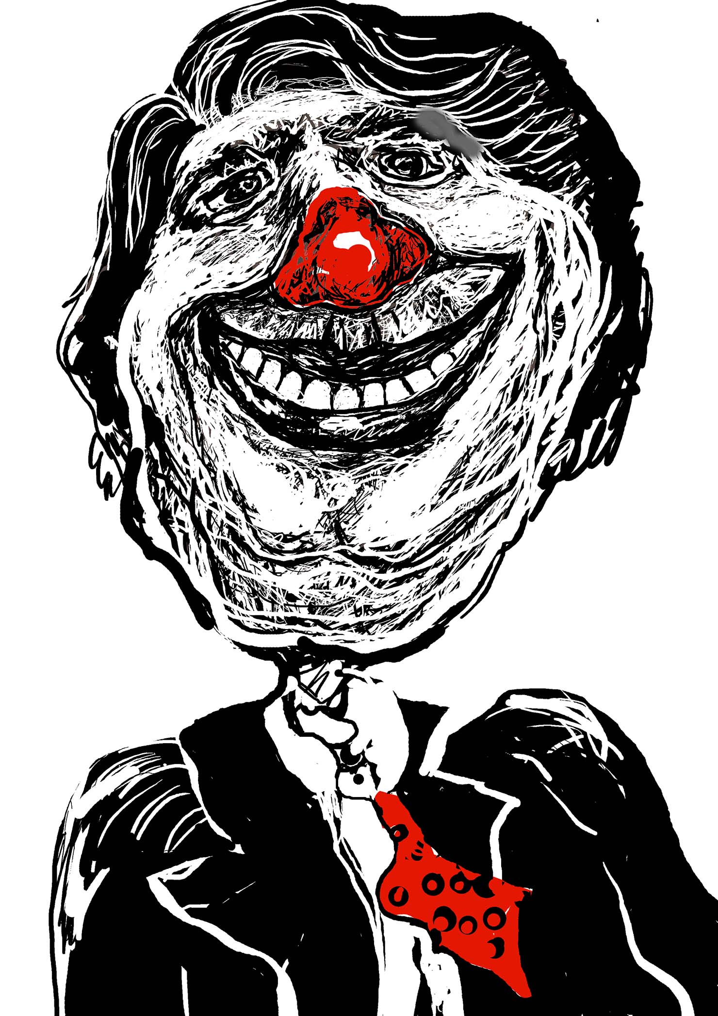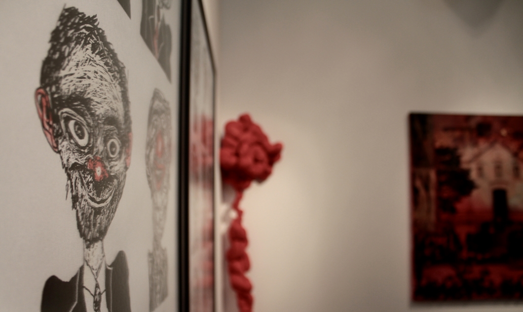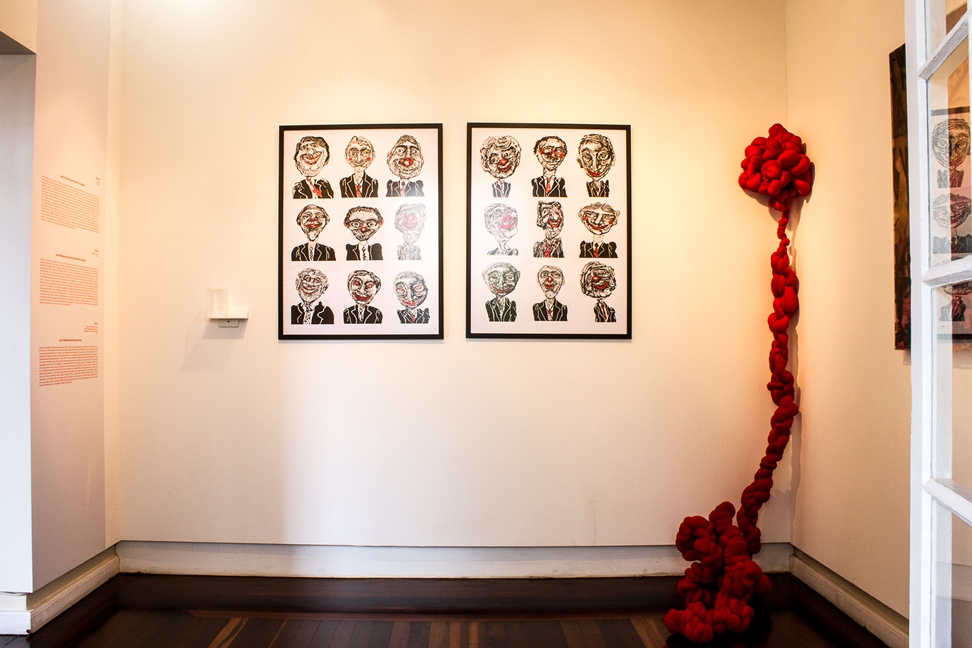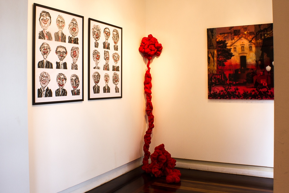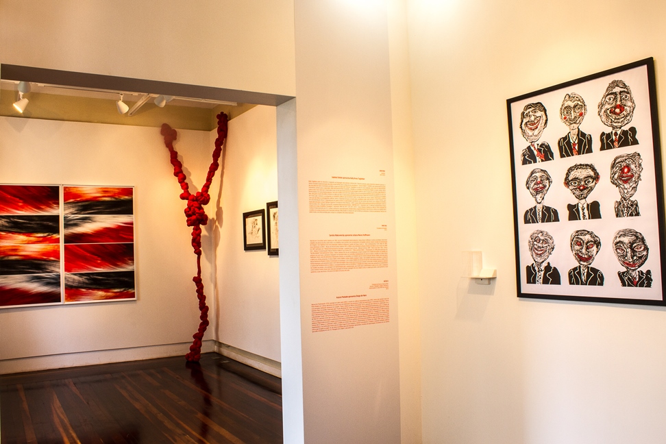 Kelly Taglieber parte do desenho e expande sua linguagem descobrindo intersecções. Desenha pinturas, grava desenhos, desenha gravuras. E nessa constante experimentação descobre novas formas para a antiga técnica da gravura – Gravura digital. O trabalho aqui apresentado faz parte de uma série de rostos inventados por Kelly os quais ela chama de “Sorrisos”. Inspirados ou não em nossa realidade, esses rostos em determinados momentos, sorriem para o espectador. Além das gravuras fixas na parede, o trabalho se completa com pequenas imagens as quais a artista coloca junto a uma “urna” para que o espectador tome sua decisão frente aos fictícios personagens políticos, para os quais ela cria Partido, Sigla, Número e Nome próprio. Em suas próprias palavras: “Unir arte e política nunca foi meu objetivo. Nunca fui de levantar bandeiras para um partido ou outro. De fato, não gosto muito de política, embora eu saiba que ela é o instrumento principal da democracia. Diante dos inúmeros incidentes de corrupção em nosso país, comecei a acompanhar os incidentes políticos que acontecem todos os dias diante dos nossos narizes. Observando a maneira com que são feitas as propagandas políticas, tenho a impressão de que no fundo estes candidatos estão rindo do povo. O nome “Sorrisos” vem em uma devolução irônica”. Originalmente em preto e branco os personagens receberam um tom ainda mais irônico com a adição do vermelho, especialmente para compor Diálogos Expostos. Formada em Artes Plásticas – UDESC, desde 2000 a artista participa de diversas exposições; sendo as mais recentes: 2012- Menção Honrosa (III Competitiva Nacional de Ilustração – UNEPAR), 2013 – Exposição Lote 7 (Coletiva) Fundação Museu Hassis, Coletiva do Grupo Arte&Afins “Passagem”, Exposição “Além do 3X4” e em 2013 -2014 – Cenas Urbanas (Coletiva) no Hall do Centro Integrado de Cultura e Estacionamento do CIC. Conheci a artista em suas exposições, e desde então, a experimentação e rigor técnico, unido ao seu diálogo ético e estético no campo da arte, já me chamavam atenção. Kelly amplia os campos em que se debruça a pesquisar, é intensa e persistente. Pareceu-me deste modo, a escolha acertada para compor os complexos Nós desta exposição.