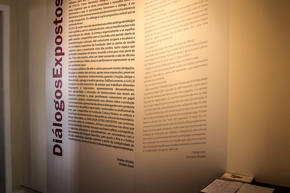 Nessa atmosfera, os DIÁLOGOS ESTÃO EXPOSTOS: nas conversas possíveis entre os curadores, artistas e produtores; nas obras que ora se namoram, ora não, mas que suscitam o refletir, o ressignificar, o repensar processos e procedimentos, em consonância com o pensamento de Jacques Rancière, para quem a Arte e a Política só são autênticas quando ocorrem a partir da multiplicidade de manifestações, no encontro discordante das percepções individuais.