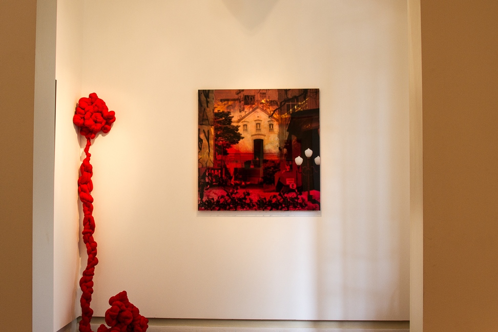 Nascida em Concórdia, Santa Catarina, em 1965, vive em Florianópolis desde pequena. Juliana Neves Hoffmann é artista autodidata. Desenvolve trabalhos de pintura (acrílica sobre tela) e nos trabalhos mais recentes vem incorporando a fotografia à pintura criando camadas de sobreposição de imagens. Sua trajetória inclui uma exposição coletiva no Museum Castello de Rivara, Centro d´Arte Contemporanea, Turim, Itália, em 2005, duas individuais no MASC – Museu de Arte de Santa Catarina (1991 e 2004) e uma individual no Museu Histórico do Palácio Cruz e Souza, em 2008. Em 2007 participou da 1ª Bienal Internacional de Sorocaba – curadoria Francis Dosne – Menção honrosa. 2009 – Tribut à Xul Solar –Paris – França. 2011 – Mostra “Contaminações” Museu Histórico-Palácio Cruz e Sousa. 2012 – “Olhos da Alma” MASC – Florianópolis. Em 2008 juliana participou do “No Boundaries” International Art Colony – North Carolina-USA. Ao ser convidada para compor a equipe com a tarefa de escolher um trabalho em pintura e ao ouvir que o elemento integrador da exposição seria a cor vermelha, imediatamente me veio em mente o trabalho de Juliana Neves Hoffmann. Assim, unia três elementos importantes: pintura, cor vermelha e um trabalho que me chama a atenção, fala de cidades, tema que adoro e adoto em minhas pesquisas. A nossa cidade, outras cidades, muitas cidades, qualquer cidade. Este trabalho apresenta a escadaria e a igreja de Nossa Senhora do Rosário (Centro, Florianópolis) em destaque. Com a virada midiática do século XX não tem mais sentido pensar as mídias como formas estanques, pois passamos para o outro lado da margem: não se trata mais de procurar os limites, muito pelo contrário, passamos a valorizar a ruptura das fronteiras entre as mídias e, consequentemente, entre as disciplinas. O trabalho de Juliana, nesta obra, apresenta um derretimento do modelo da imitatio, uma passagem da representação para a apresentação, que tende para a performance e para se ver a arte e a literatura como eventos. Evento, nesse caso, mais para passagem do tempo, passagem de uma cidade a outra. A cidade que existe, a que gostamos, a que queremos, a que não temos. Um pouco de nada e um pouco de cada.