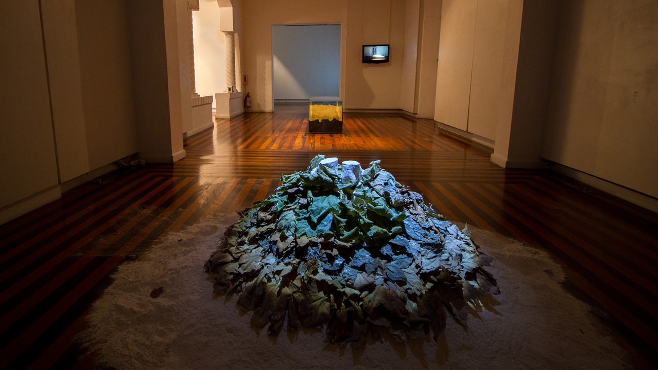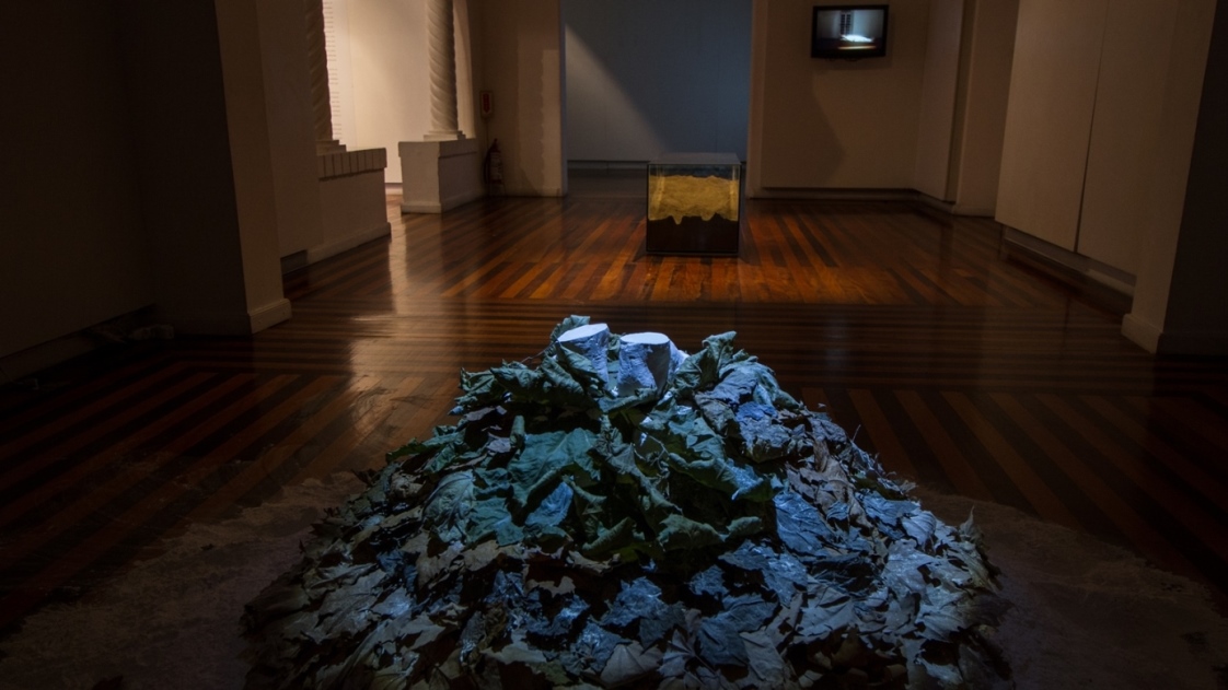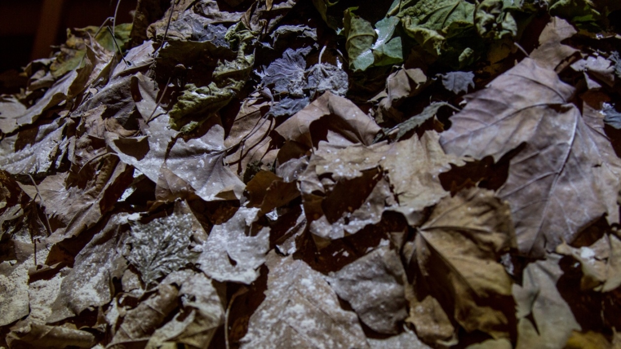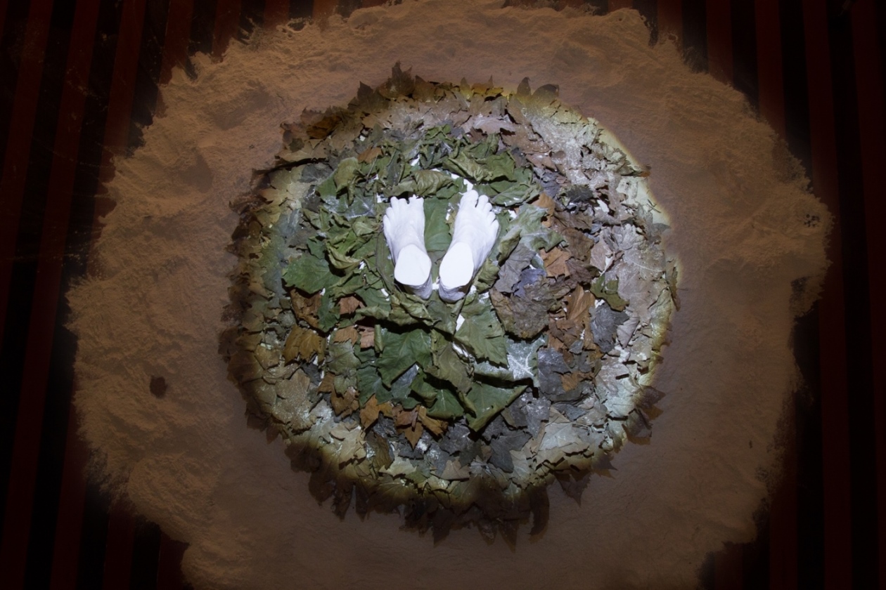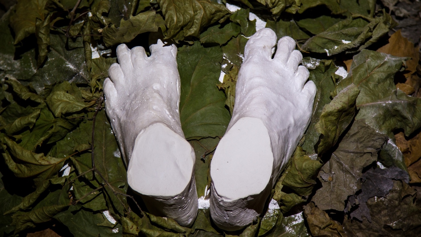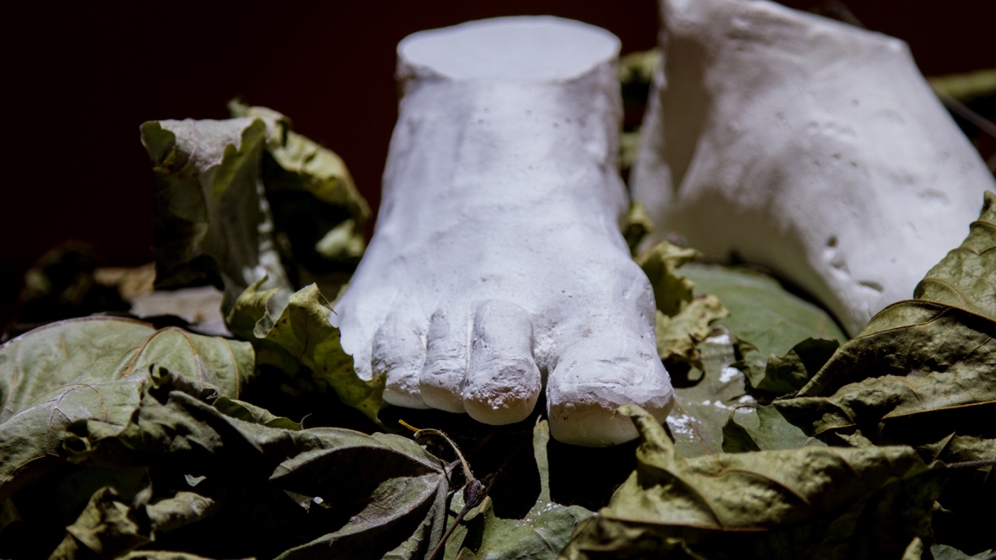 Entre nós, o silêncio, instalação, 2018. Molde em gesso, folhas de plátanos e talco, dimensões variadas.