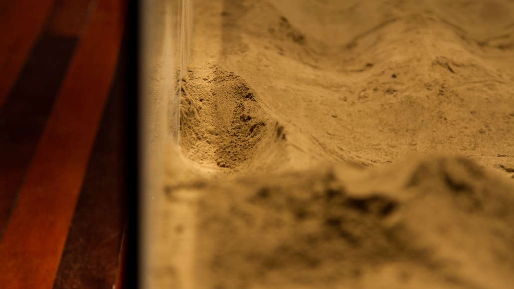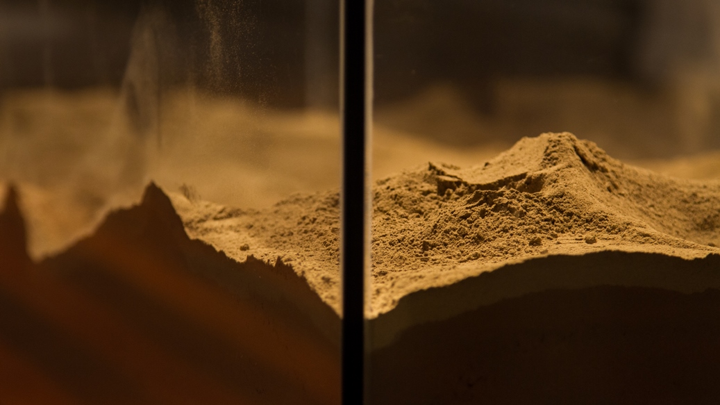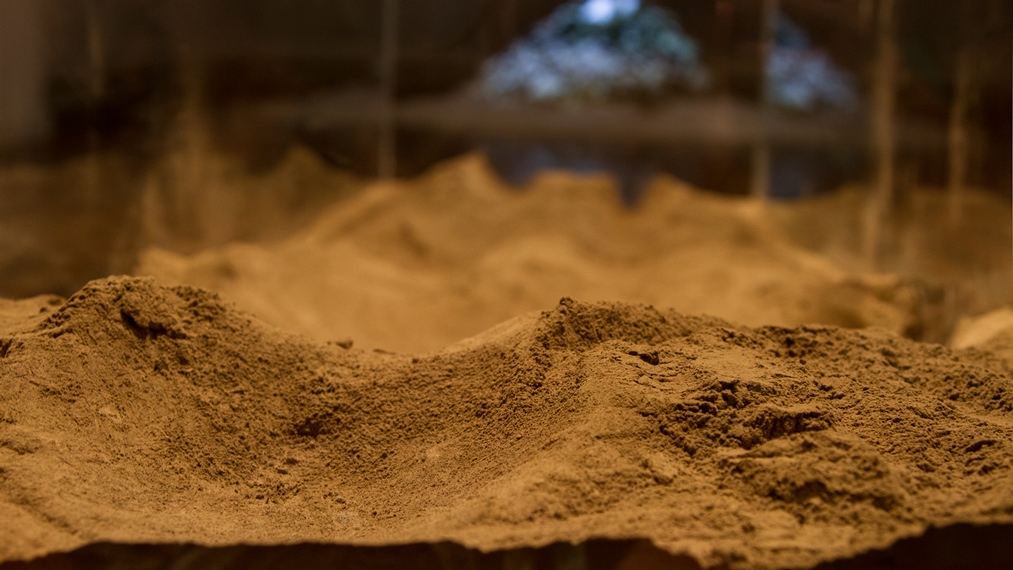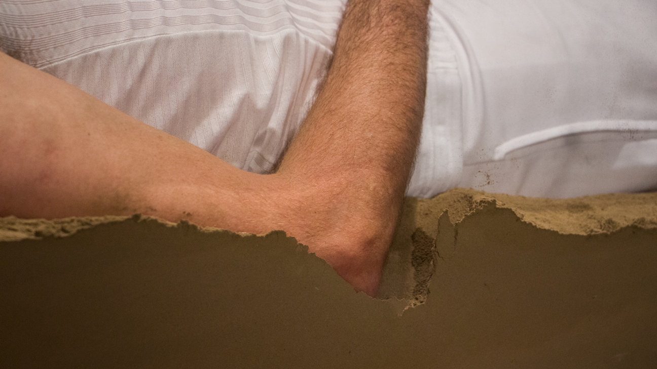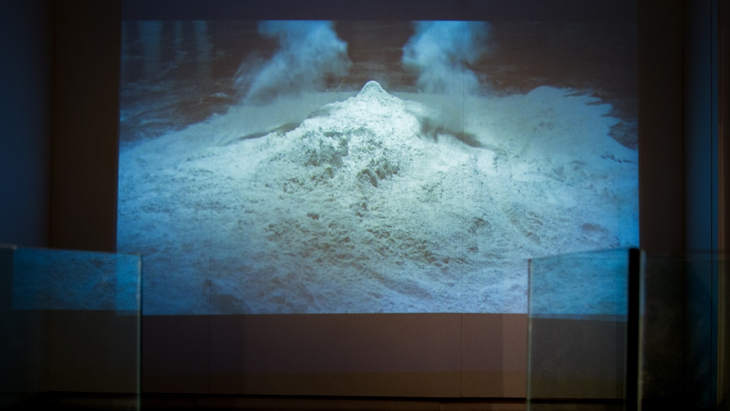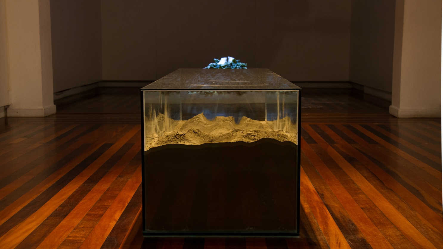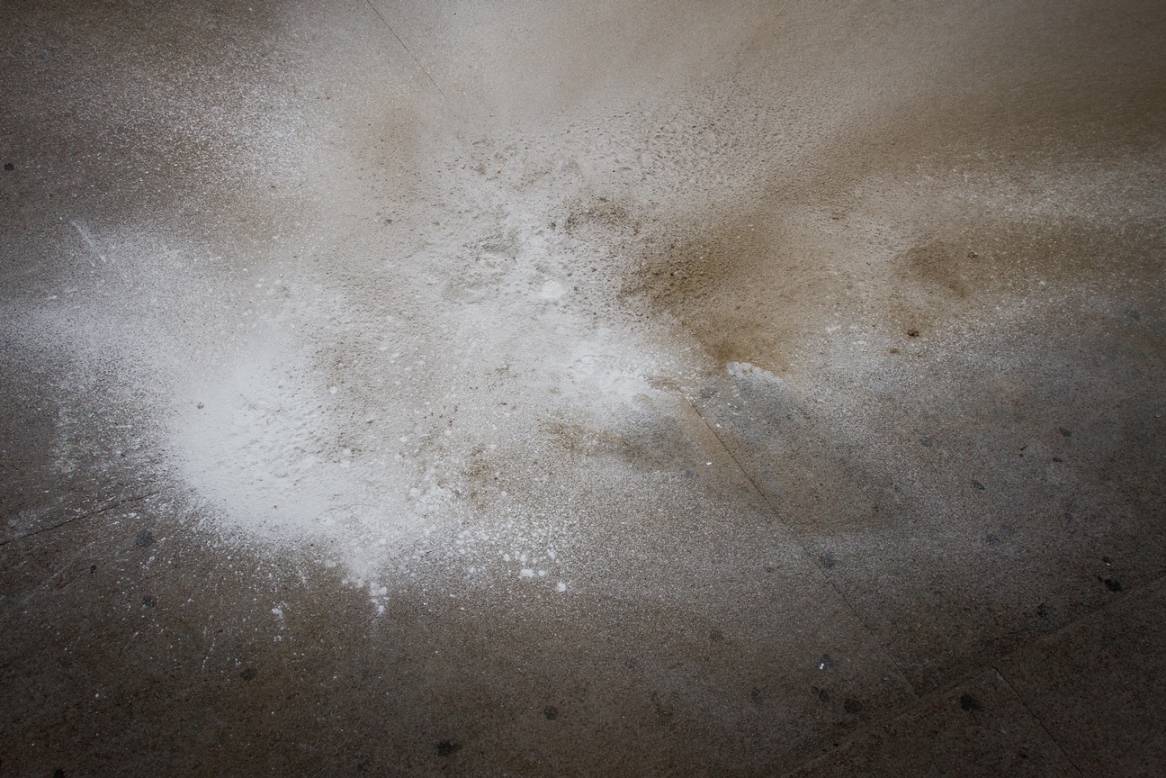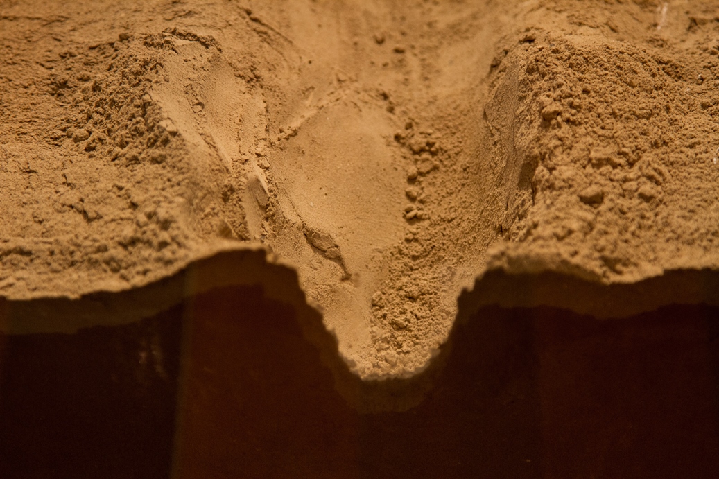 Entre nós, o silêncio, instalação, 2018. Molde em gesso, folhas de plátanos e talco, dimensões variadas.