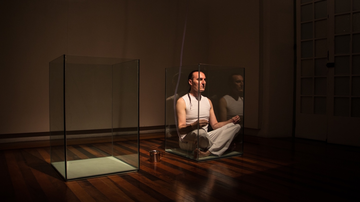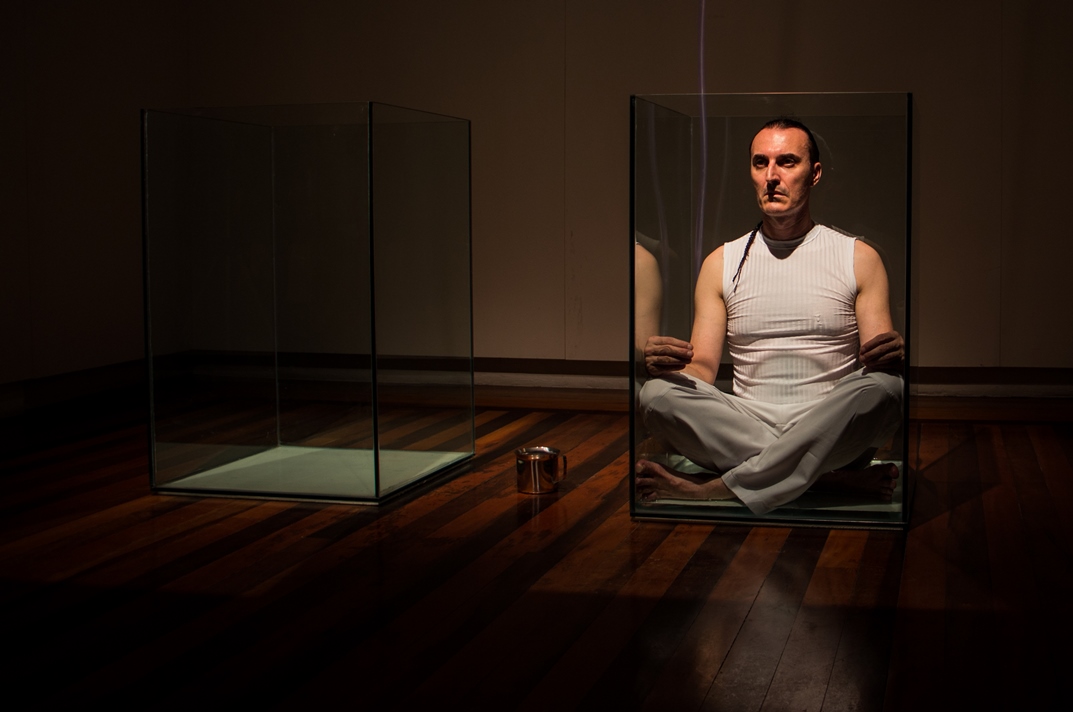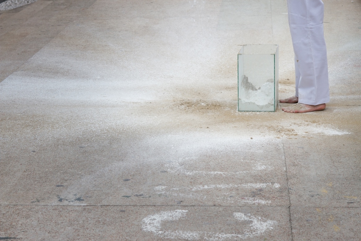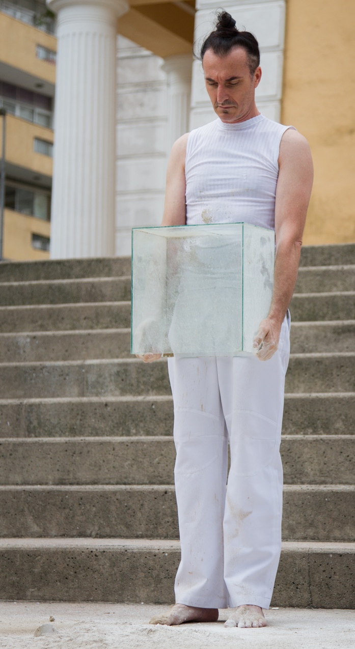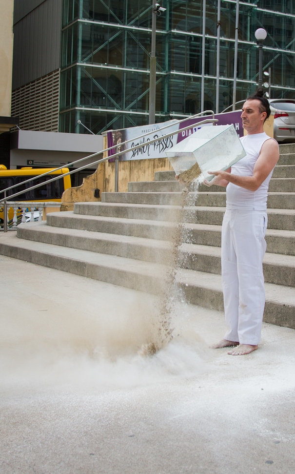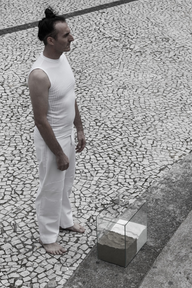 O valor do ser e do ter presentifica-se nas ações e entre os elementos que percorrem a obra do artista: talco, cinza, terra, café, pó de ouro, pó de prata, água, vidro, transparência, medidas matemáticas que são extensões do corpo; que parecem ser os vértices das performances.