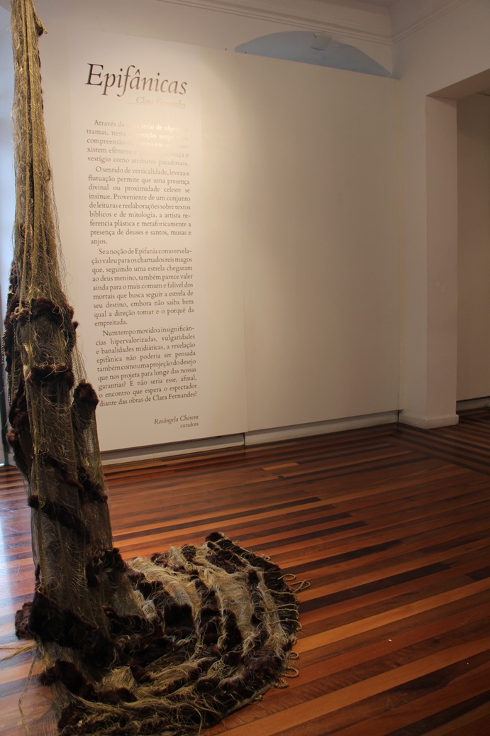 A maioria das nove instalações de Epifânicas se aproxima do habitat onde a artista mora – o interior da Ilha de Santa Catarina – apresentando elementos da flora nativa como é o caso da embiruçu e da sibipiruna, de onde são extraídos materiais para confecção das obras. É por meio destes materiais naturais em suportes de metal, madeira e seda que a artista explorou as escrituras dos profetas maiores, fazendo coexistir etéreo e terreno numa concepção expandida do tempo. A exposição parte de tecidos, objetos, instalações, desenhos e tramas criados, a princípio para uma proposição performática pensada a partir de leituras e reelaborações sobre textos bíblicos e mitologia, que referencia plástica e metaforicamente a presença de deuses e santos, musas e anjos. Clara Fernandes nasceu em São Paulo, estudou na faculdade de Psicologia da PUC/SP e na Escola de Comunicações e Artes da USP. Vive e trabalha em Florianópolis desde 1983.