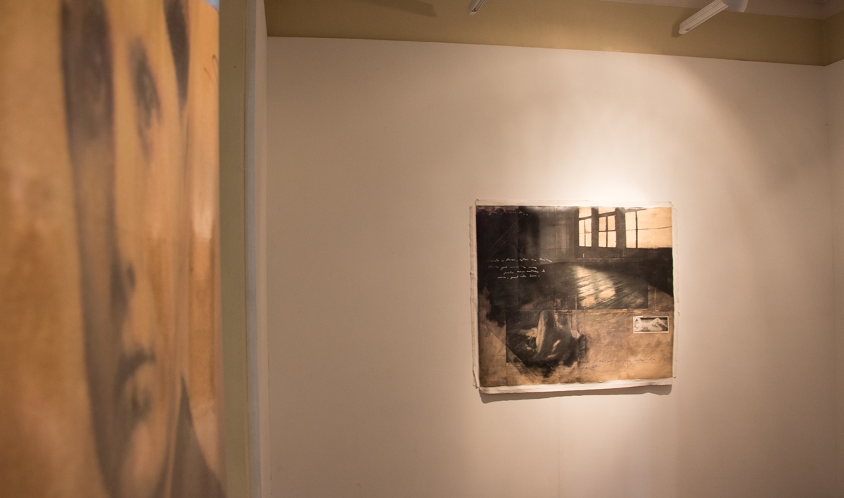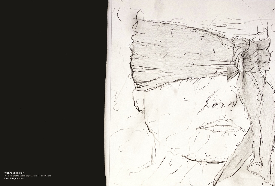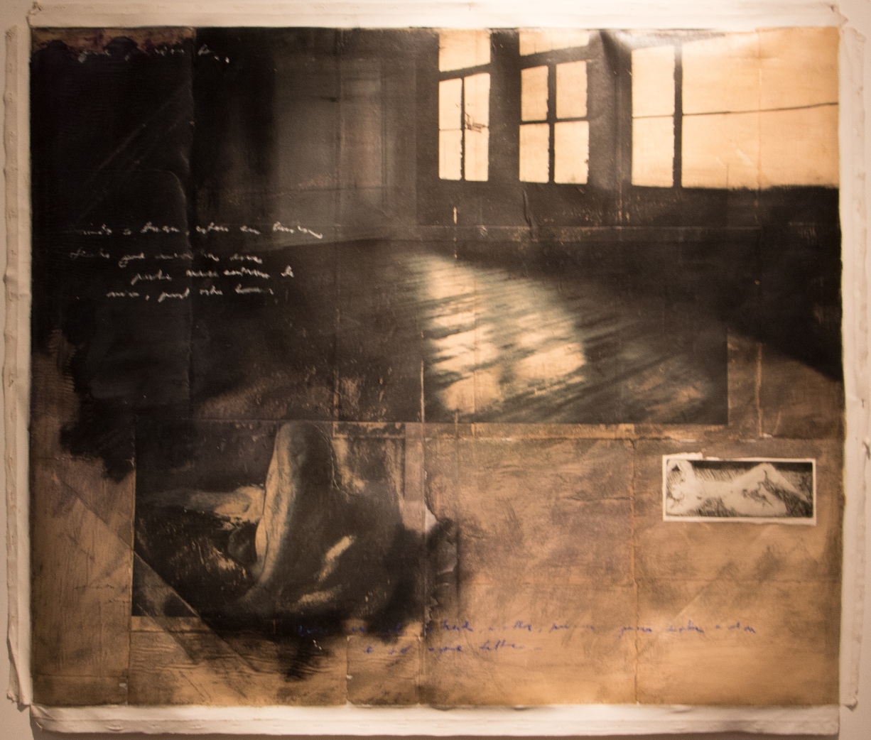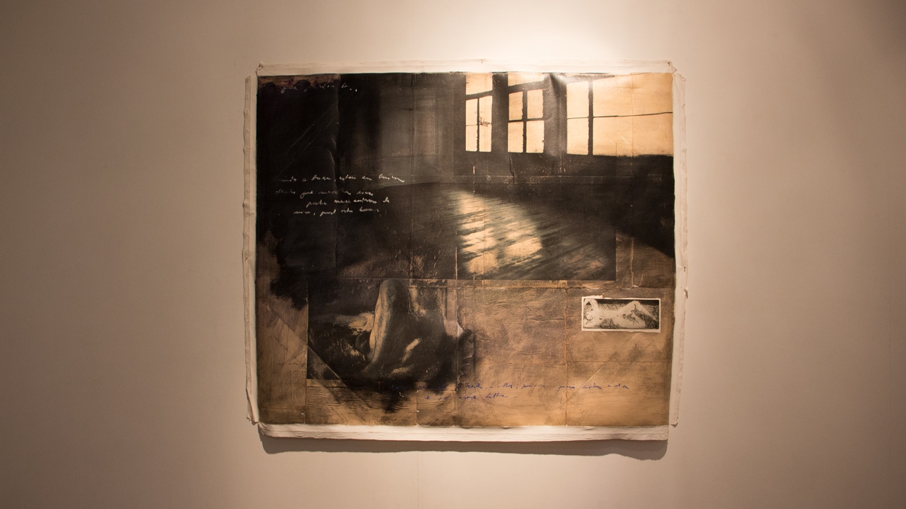 Assim, destaca-se a tela After Darkness I (acrílica sobre tela com fotografia e colagem, 2014), em que a foto de um corpo masculino, em situação de escorço, aparece à esquerda e em primeiro plano, enquanto que no lado direito, em segundo plano, comparece o desenho feito pelo artista de um nu deitado de lado com a genitália evidenciada. Ambos os corpos estão numa sala escura, apesar da abundante entrada de luz pelas vidraças fechadas. Completando a montagem, fragmentos textuais ampliam o descontexto, por onde se infiltra uma atmosfera erótica. Neste jogo de rememoração e metamorfose, recombinando enredos e cenas, o conteúdo biográfico é obliterado, gerando deslizamentos e novas potencias mnemônicas. Os abandonos e as redefinições, as tentativas e as premeditações surgem cifradas, funcionando como significante para o espectador que se encontra diante da obra.