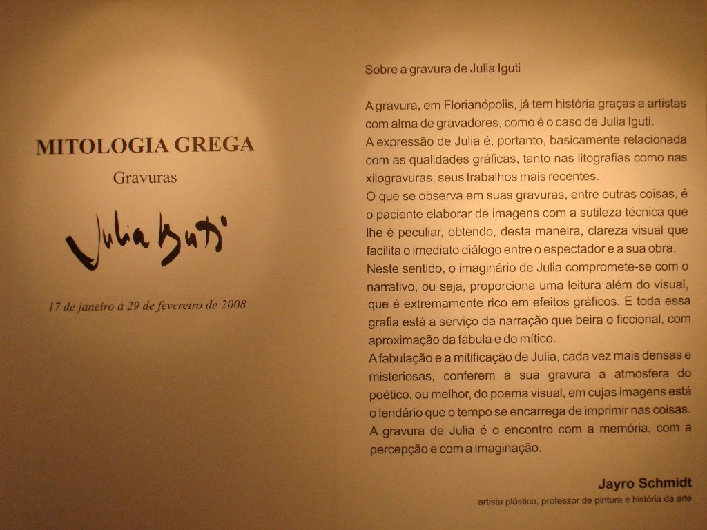 A gravura, em Florianópolis, já tem história graças a artistas com alma de gravadores, como é o caso de Julia Iguti.A expressão de Julia é, portanto, basicamente relacionada com as qualidades gráficas, tanto nas litografias como nas xilogravuras, seus trabalhos mais recentes.
