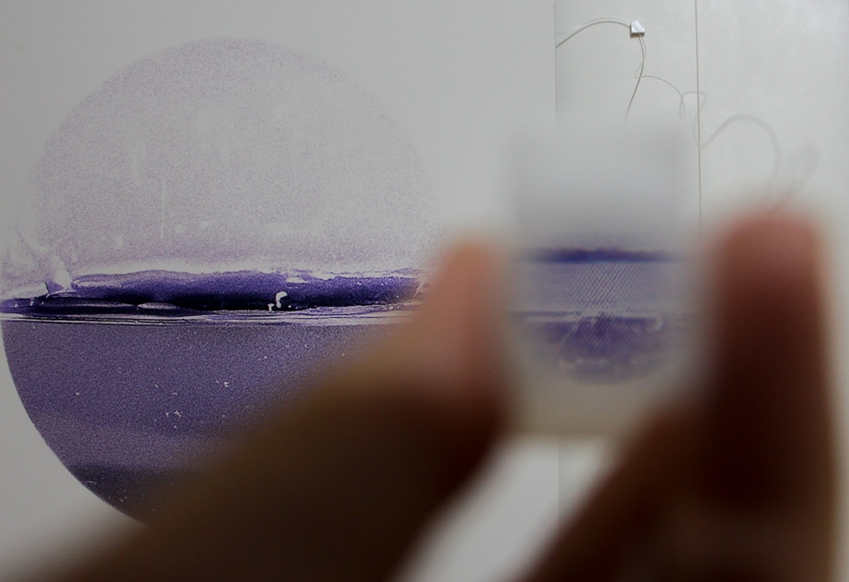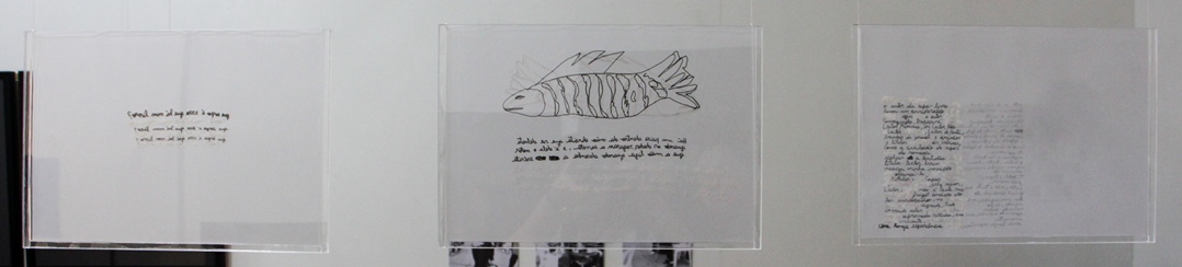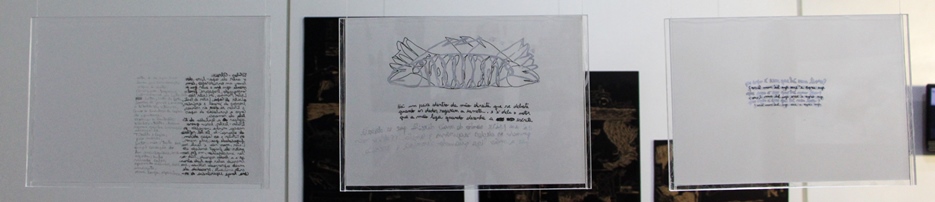 ** Título completo da obra de Patrícia Galelli: Um livro é uma carne falsa I – um livro é uma carne falsa, Um livro é uma carne falsa II – motor de desenhar escrita, Um livro é uma carne falsa III – leitor de vitrine, 2018. Nanquim sobre papel vegetal e liquid paper, 29,7x21cm.