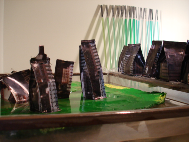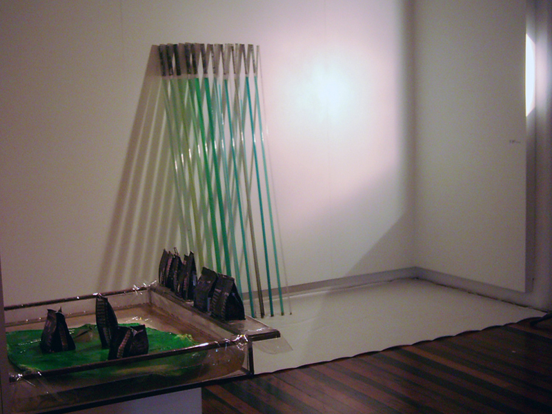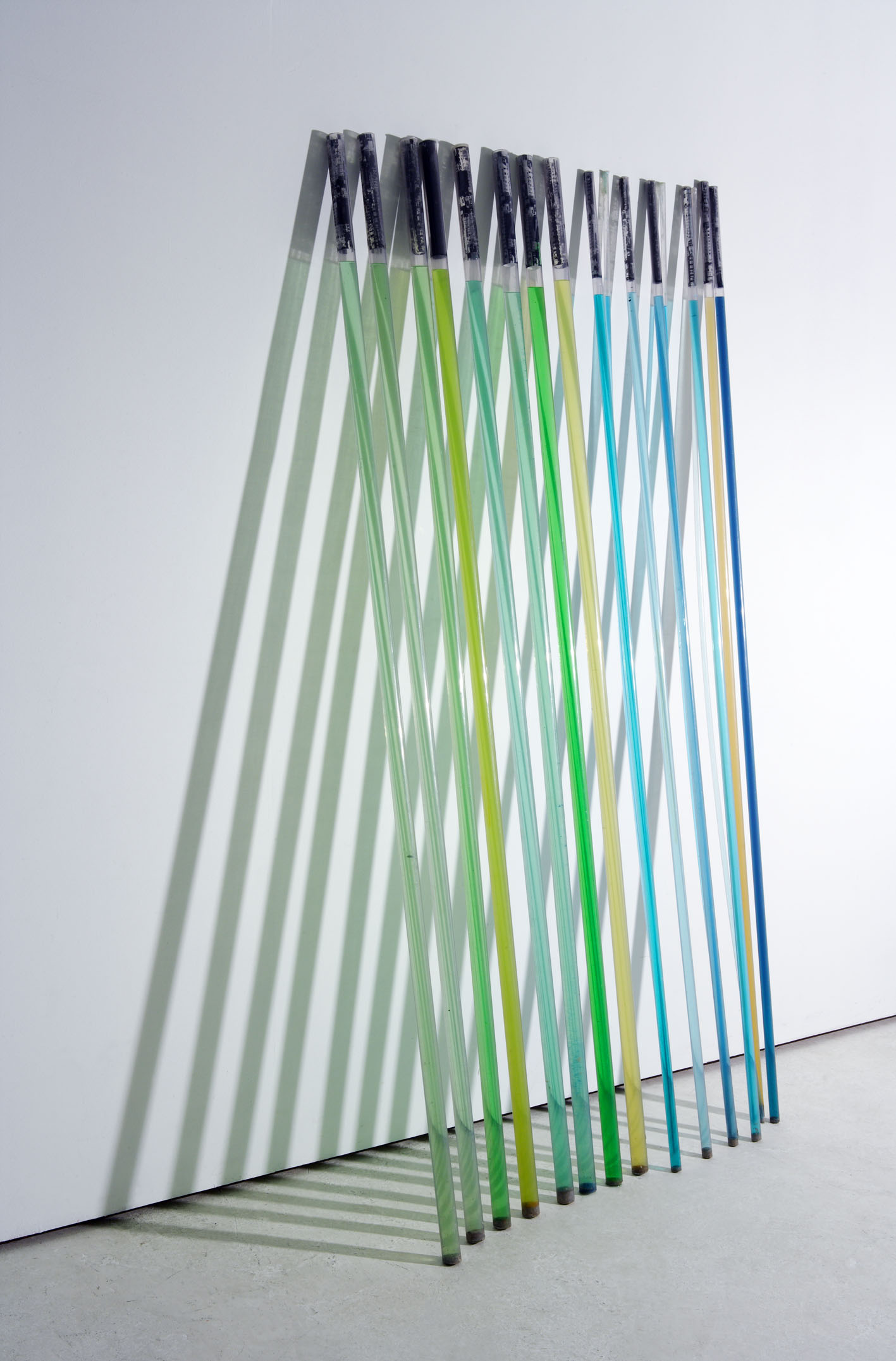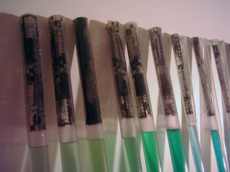 Flávia Fernandes. Horizonte, Tubos de PVC transparente, água pigmentada e fotografia, 1,96x2m.