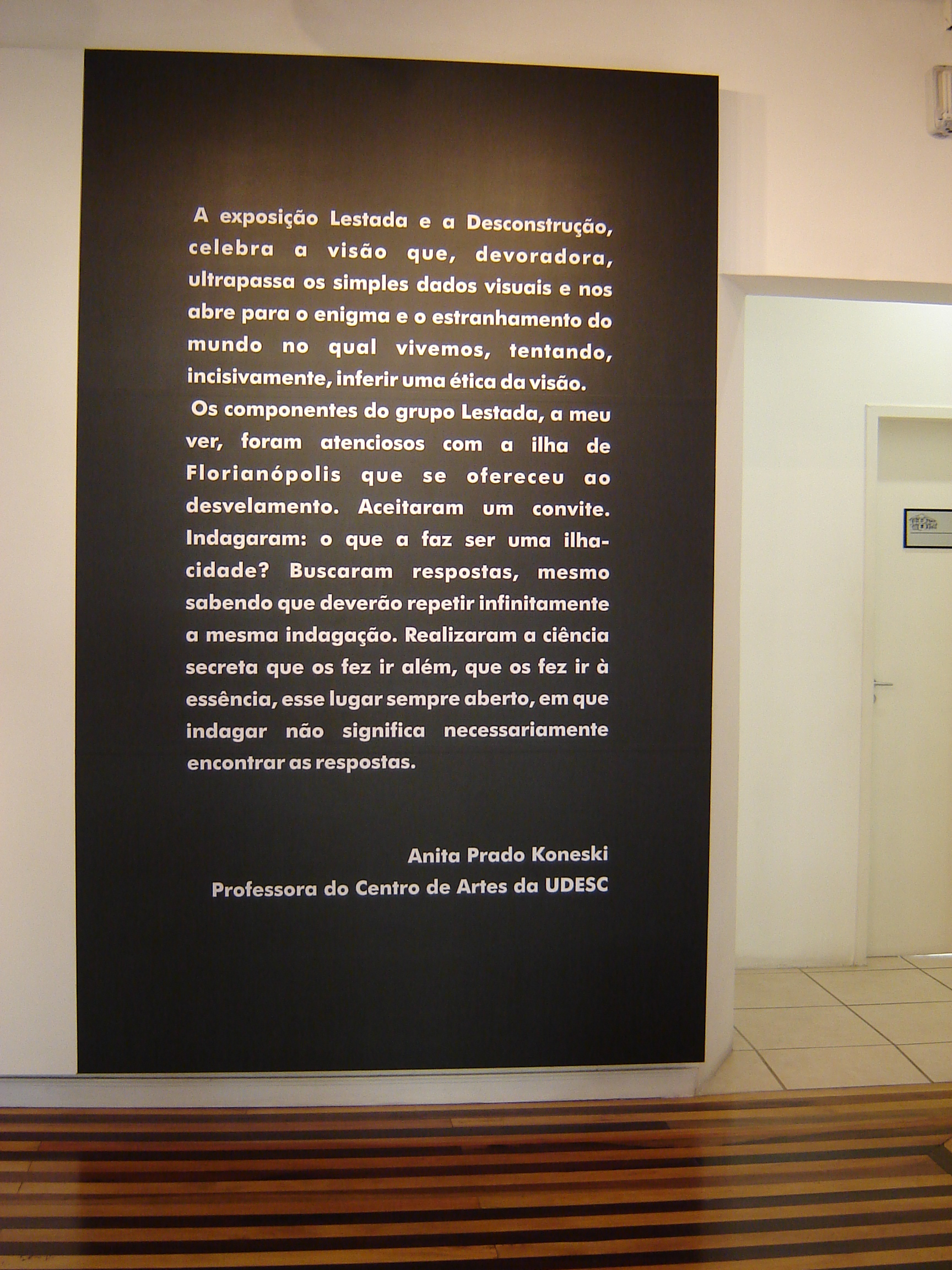 Os componentes do grupo Lestada, a meu ver, foram atenciosos com a ilha de Florianópolis que se ofereceu ao “desvelamento”. Aceitaram um convite. Indagaram: o que a faz ser uma ilha-cidade? Buscaram respostas, mesmo sabendo que deverão repetir infinitamente a mesma indagação. Realizaram a ciência secreta que os fez ir “além”, que os fez ir à essência, esse lugar sempre aberto, em que indagar não significa necessariamente encontrar as respostas.