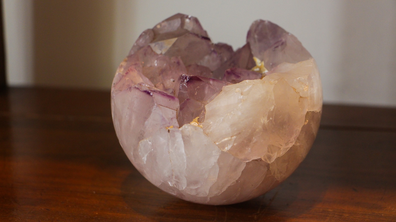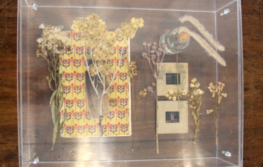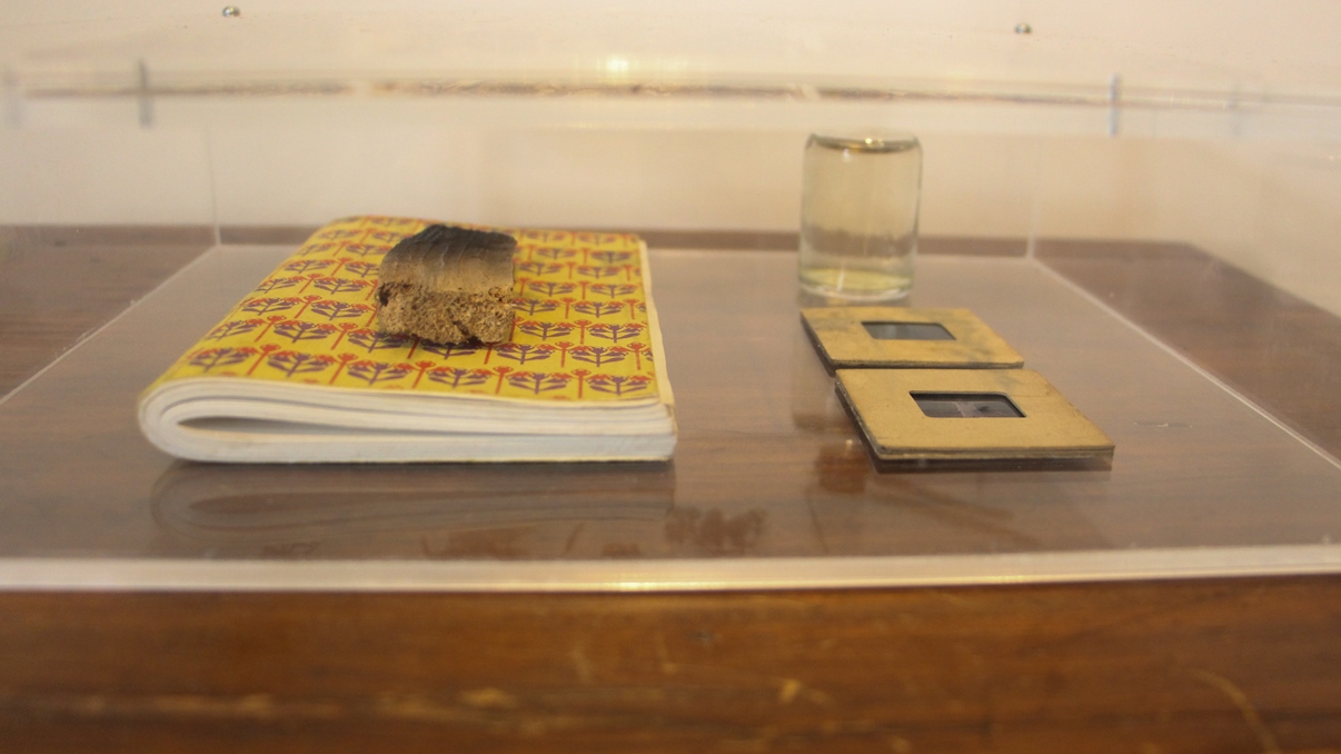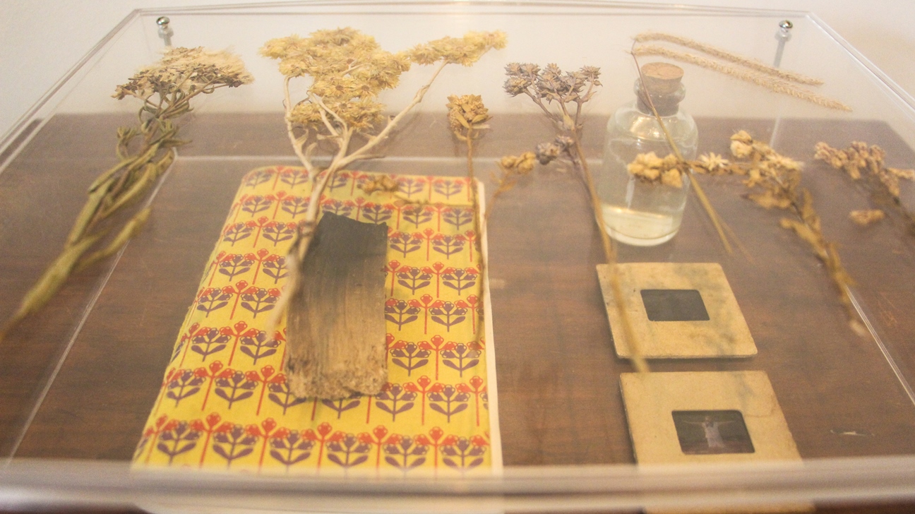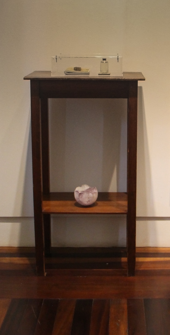 Vestígios (detalhe), 2014-2016. Caixa de acrílico com caderno, frascos de vidro, pau-santo, slides e pedra ametista, em aparador de madeira antigo.