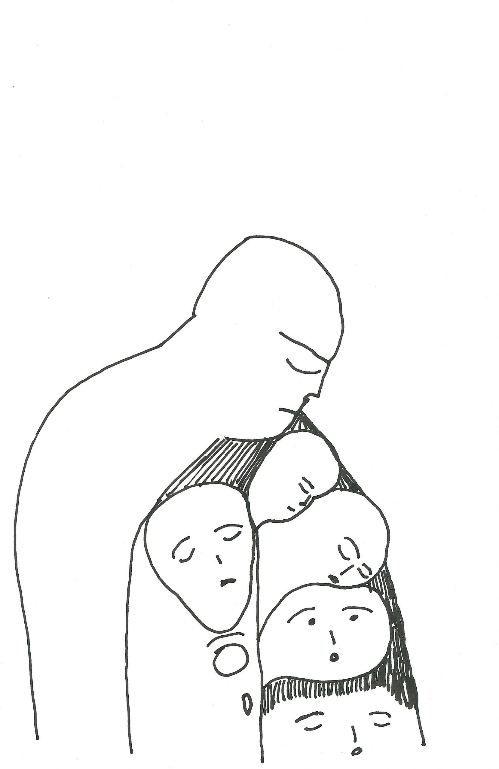 Eu sou uma pizza ainda Isso faz com que eu me mova lentamente, coração aberto, abrigando seres noturnos que ali se acomodam. Ser uma pizza é ser aquele que se entrega como alimento. Saciando os famintos. Personagens amontoados em grupos, fantasmas, gosma, meninos encapuçados formando totens, juntos, como se o abraço fosse o único abrigo possível. Corpos que se fundem, cabeças brotando de cabeças.