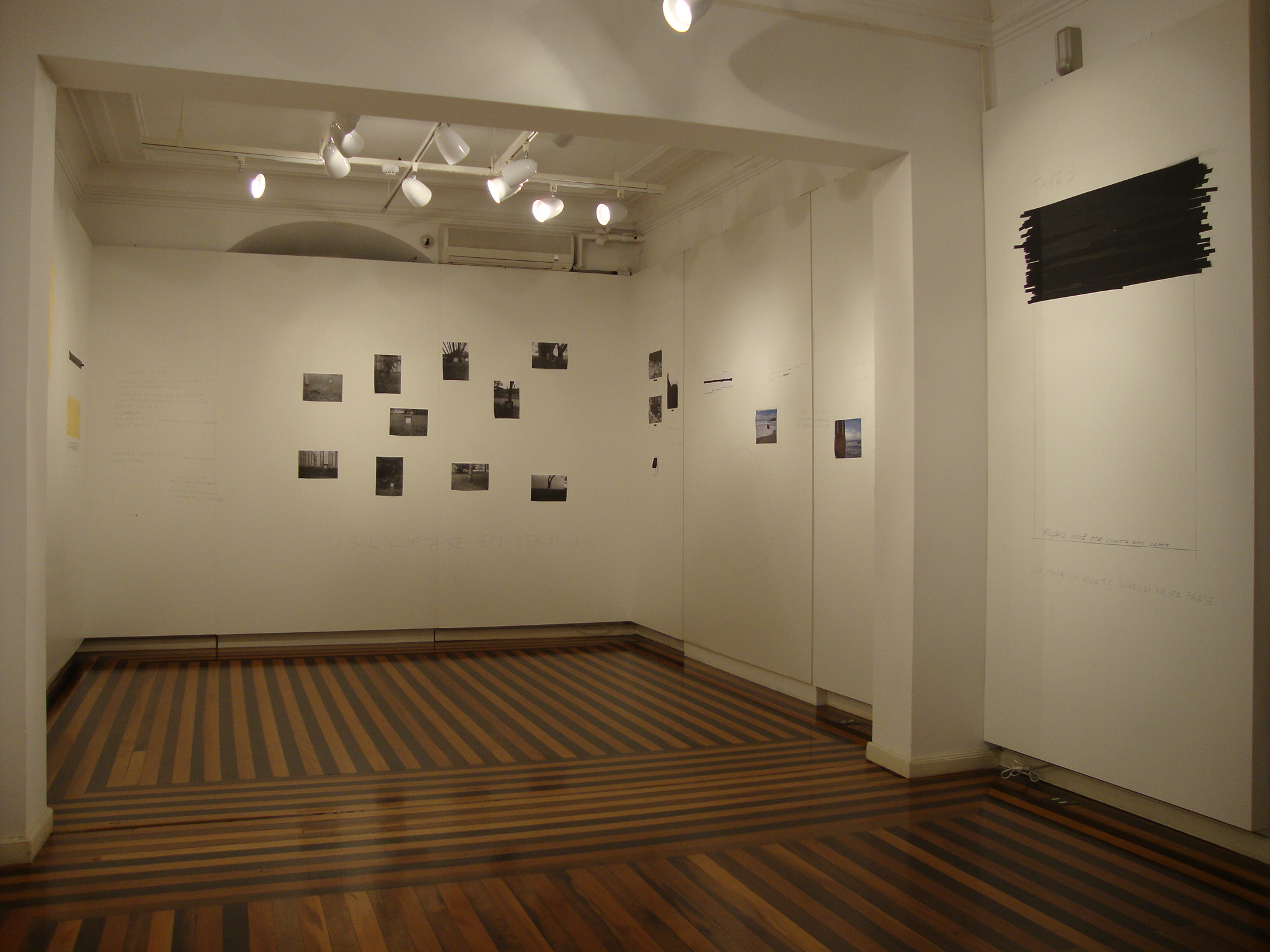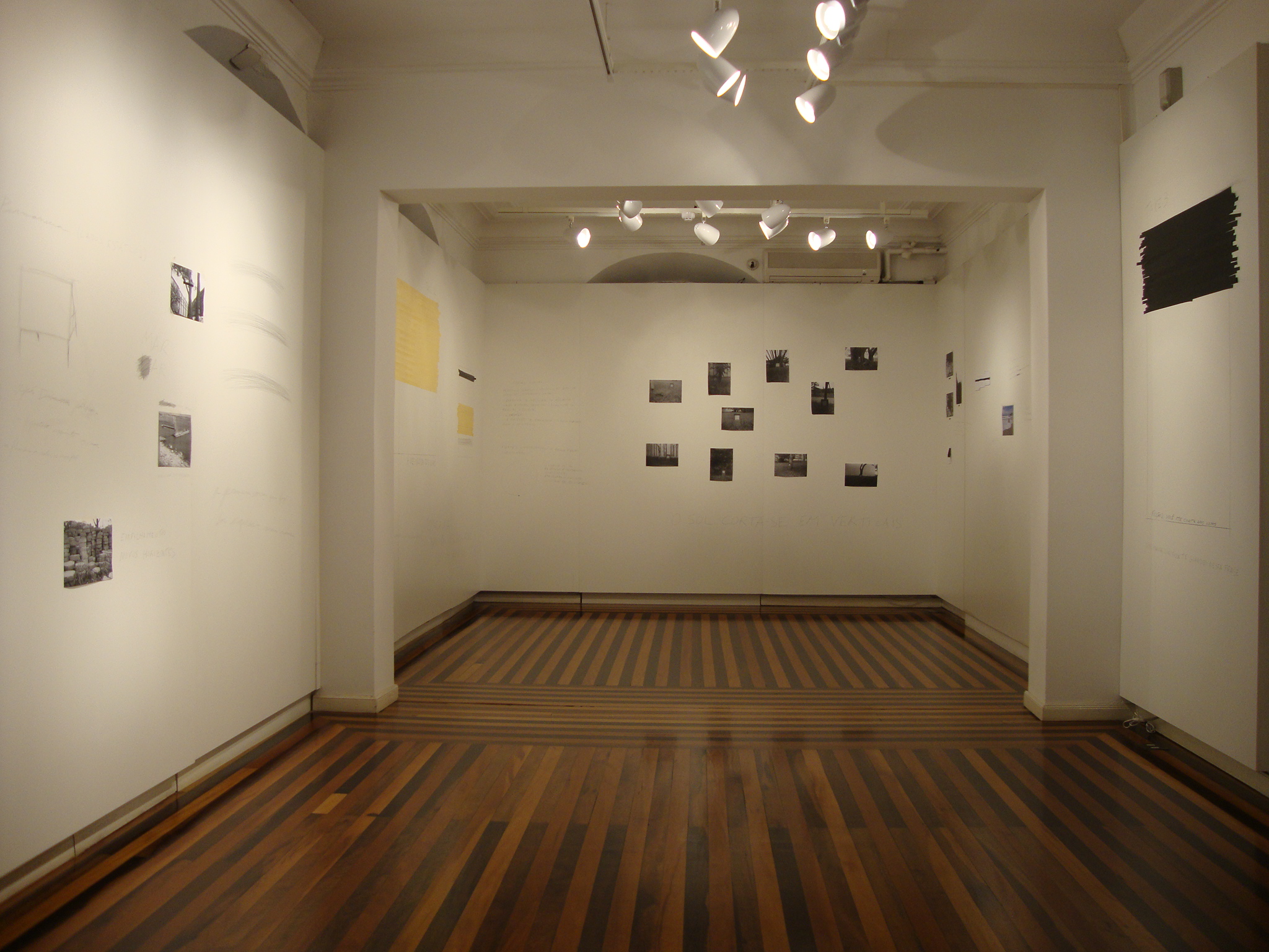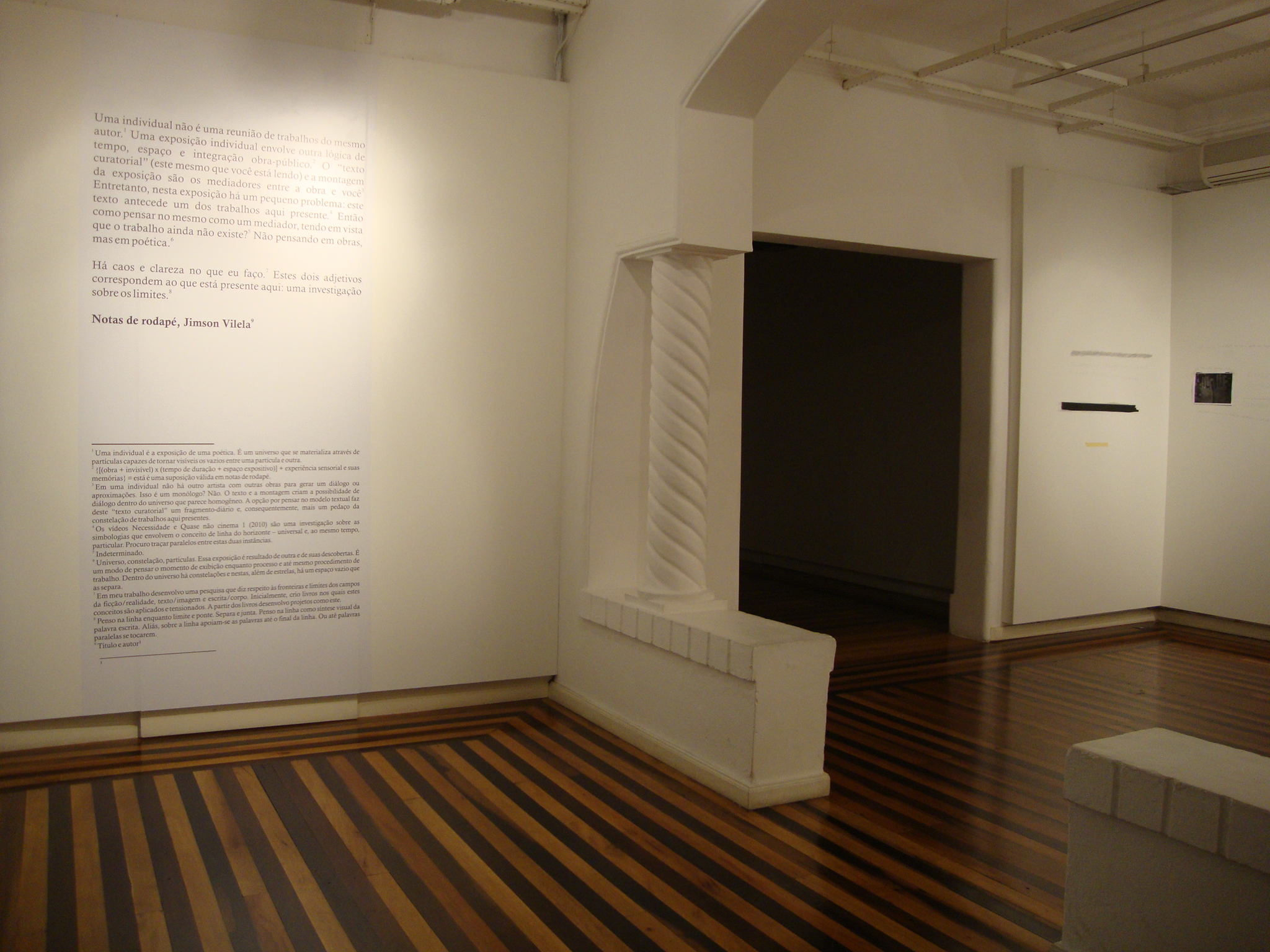 ¹ Uma individual é a exposição de uma poética. É um universo que se materializa através de partículas capazes de tomar visíveis os vazios entre uma partícula e outra.² {[(obra + invisível) x (tempo de duração + espaço expositivo)] + experiência sensorial e suas memórias} = esta é uma suposição válida em notas de rodapé.
