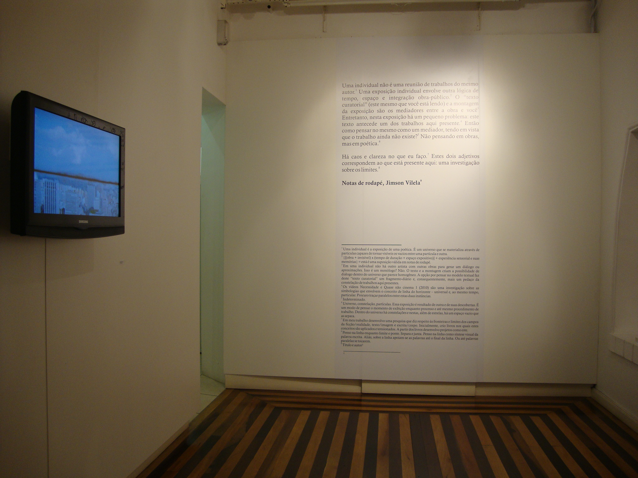 Selecionado pelo Edital Fernando Beck de Exposições 2011, Jimson Vilela apresenta a mostra Notas de Rodapé. São trabalhos de vídeo e intervenção/instalação em que o artista reduz a noção da paisagem ao elemento visual da linha do horizonte.