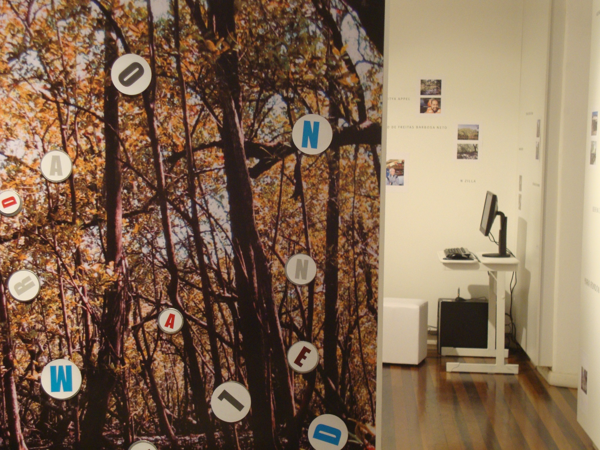 Ambientação do espaço da exposição como uma instalação-ambiente orgânica, que apesar de ser construída artificialmente simula a respiração que no mangue é realizada pelos pneumatóforos.