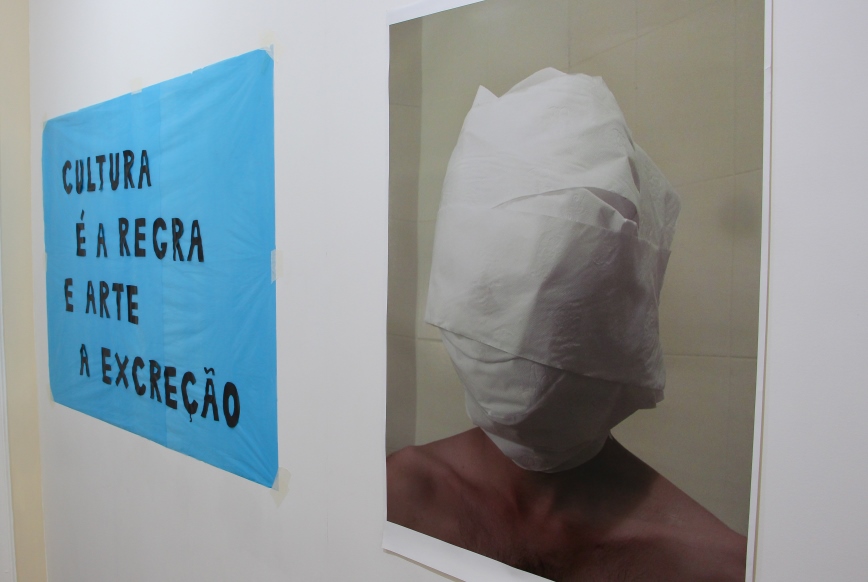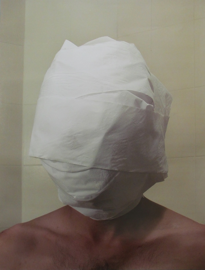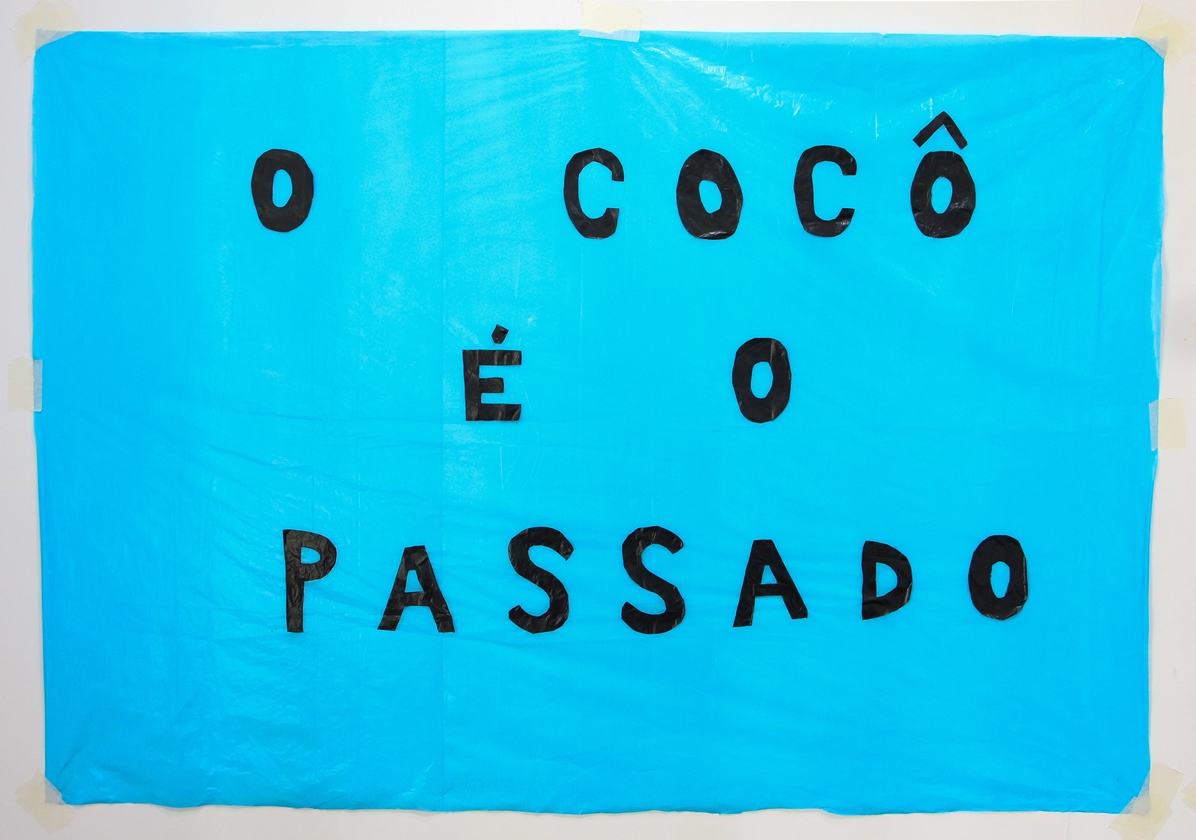 Outras duas paisagens, uma de palavras, de sacos de lixos pretos e azuis, tríade de colagem das paisagens do que é passado. O homem branco perde a identidade com papéis higiênicos que cobrem seu rosto e sua cara. Durante a