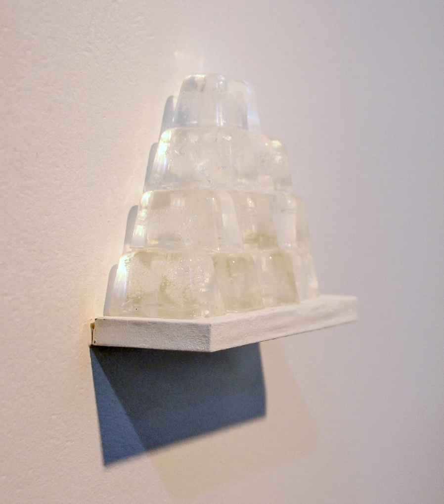 O espectador não se vê no espelho de tela branca. Uma escultura em forma de pirâmide é feita de gelo falso, que assim como a divisão de classes no real só se propõe a horizontalidade, mas permanece como promessa. Uma paisagem fria, uma natureza morta com textura e camadas de cores com pano de limpeza e cobertor de mendigo.