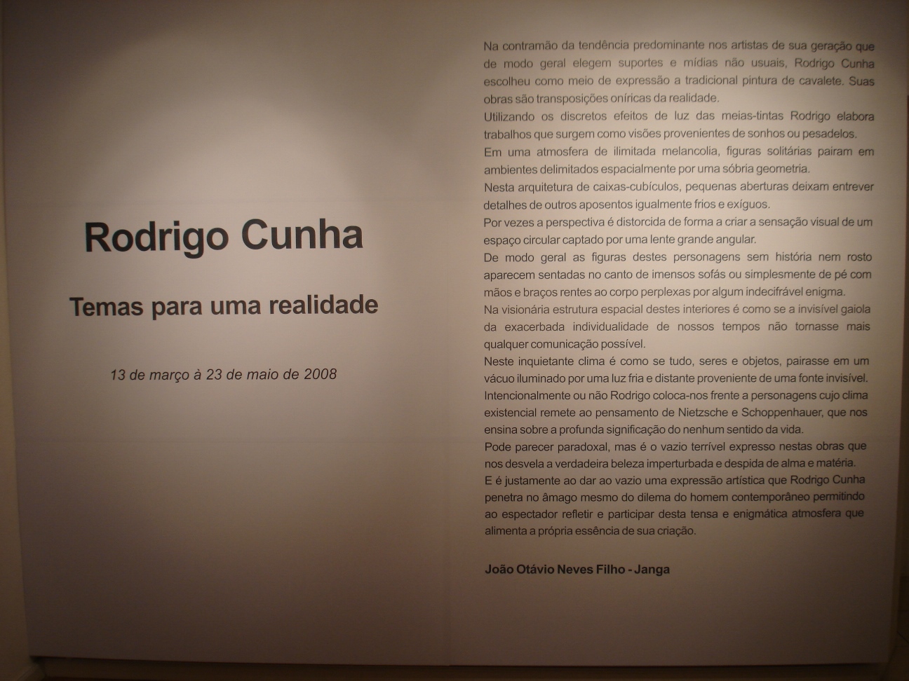 Exposição Temas para uma realidade, de Rodrigo Cunha. Na contramão da tendência predominante nos artistas de sua geração que de modo geral elegem suportes e mídias não usuais, Rodrigo Cunha escolheu como meio de expressão a tradicional pintura de cavalete. Suas obras são transposições oníricas da realidade.