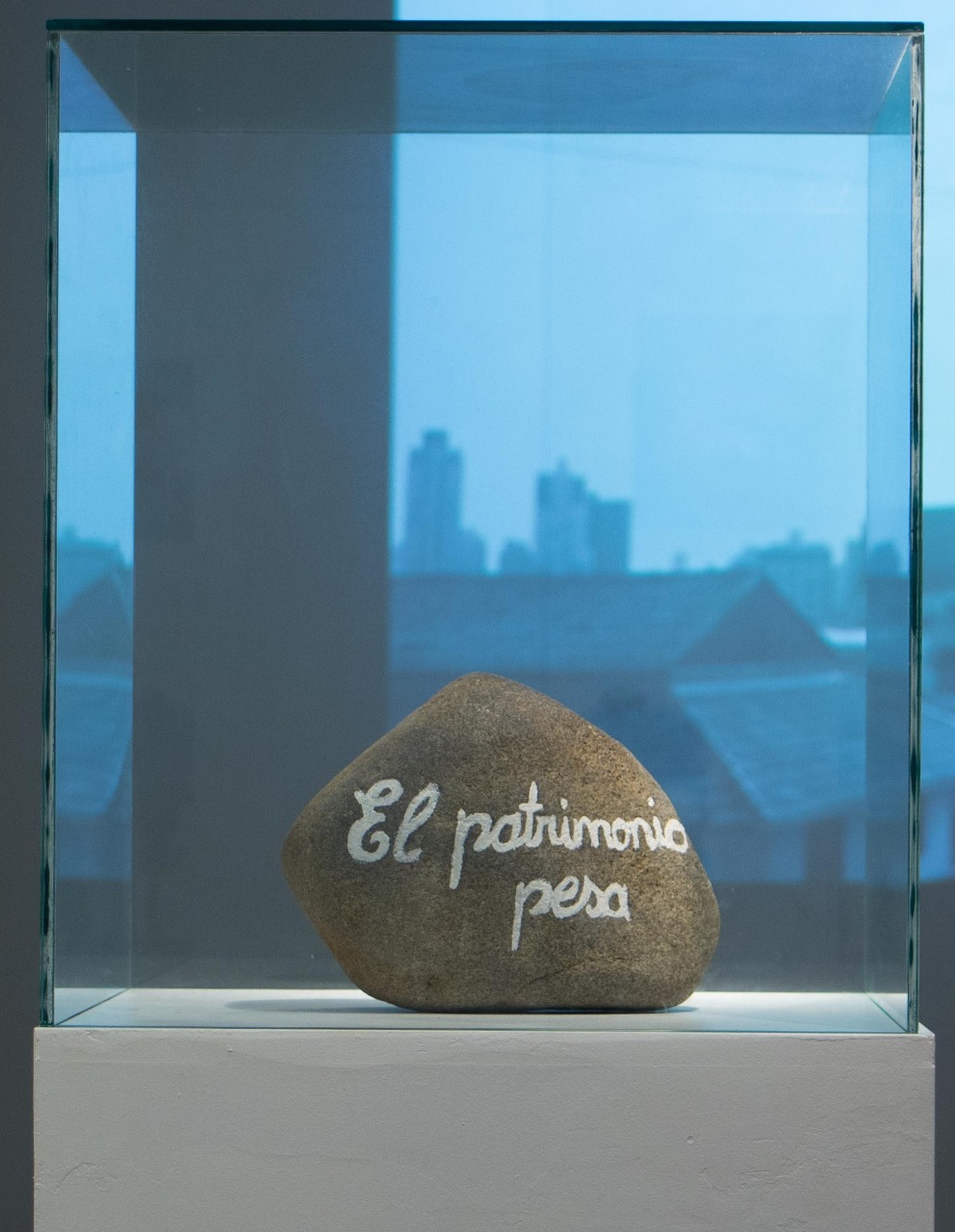 Dizem que o índio Cantuña teve que construir a igreja São Francisco, mas ao aproximar-se do prazo estipulado e ver que a construção ainda não estava pronta, Cantuña em seu desespero, optou por fazer um acordo com o diabo: terminar a construção da Igreja em troca da sua alma. Desta maneira, a construção parecia chegar ao fim exitosamente, mas Cantuña arrependido, decidiu roubar uma pedra pensando que assim, o diabo não poderia tirar sua alma, já que era impossível comprovar que a igreja estava finalizada se faltava uma pedra. Como Cantuña, decidi roubar uma pedra patrimonial da calçada da Praça de São Francisco para realizar uma série de ações sobre o objeto: nomear, pesar e percorrer. Diante da impossibilidade de voar e chegar ao Brasil a pedra nomeada “El patrimonio pesa” aparece outra que toma o seu lugar. Proveniente da Praia do Sonho, no Oceano Atlântico, a pedra foi nomeada da mesma maneira para fazer parte da exposição “Trago a modernidade”, gerida por Isadora Stähelin. O patrimônio pesa também na praia e se funde no mar.