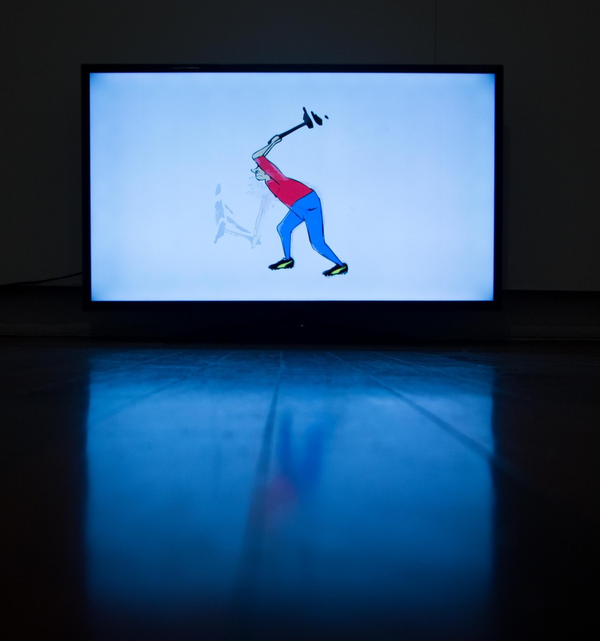 Vídeo animação realizada mediante rotoscopia. Um trabalhador de rosto triste, golpeia com um martelo o solo, sem cessar. Possui roupa de marca reconhecida e sapatos de futebol.