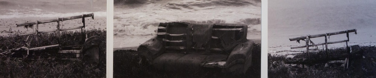 Três frames ampliados de um vídeo que registra, durante dois meses, o encontro com um sofá abandonado, em decomposição, na orla do bairro Praia Comprida, SC – Brasil.
