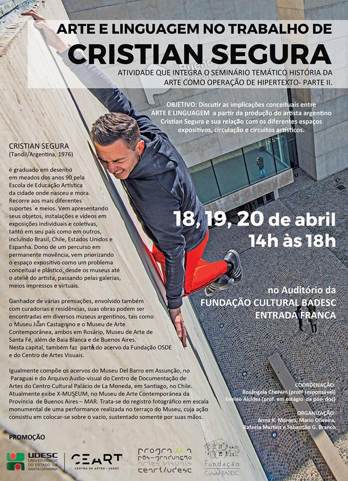 A Fundação Cultural Badesc em parceria com o PPGAV/UDESC receberá nos dias 18, 19 e 20 de abril o artista argentino Cristian Segura para uma atividade aberta ao público. O curso será das 14h às 18h no Auditório da Fundação. Não é preciso inscrição e as vagas serão por ordem de chegada.