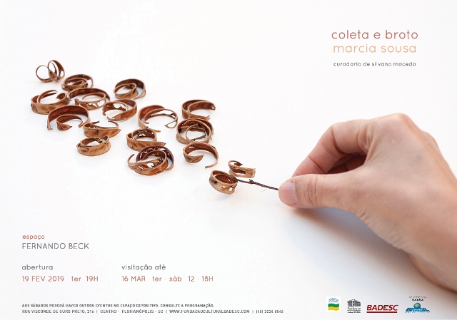 A primeira exposição de 2019 na Fundação Cultural Badesc abre na terça-feira, 19 de fevereiro, às 19h, no Espaço Fernando Beck. Coleta e broto, da artista visual Marcia Sousa aborda as formas orgânicas presentes na natureza, à coleta de elementos vegetais e o encontro com lugares que brotam. A entrada é gratuita e a mostra pode ser visitada até 16 de março.