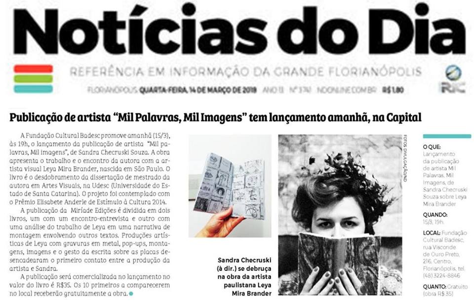 A editoria Plural, do jornal Notícias do Dia, destaca o lançamento da publicação de artista Mil palavras, Mil imagens, de Sandra Cheruski Souza