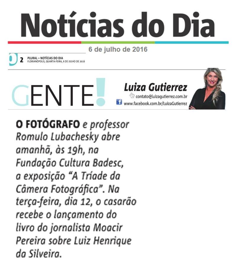 A jornalista Luiza Gutierrez, do jornal Noticias do Dia, divulga em sua coluna Gente, desta quarta (06/07) o lançamento de dois livros na Fundação Cultural Badesc. Quinta feira (07/07) A Tríade da Câmera Fotográfica, de Romulo Lubachesky. A obra busca descomplicar a fotografia como um todo e desmistificar o equipamento fotográfico. E no dia (12/07) o jornalista Moacir Pereira lança na o livro “Luiz Henrique da Silveira: Transformando Sonhos em Realidade”. A obra resgata fatos da vida do senador e um dos incentivadores da cultura no Estado.