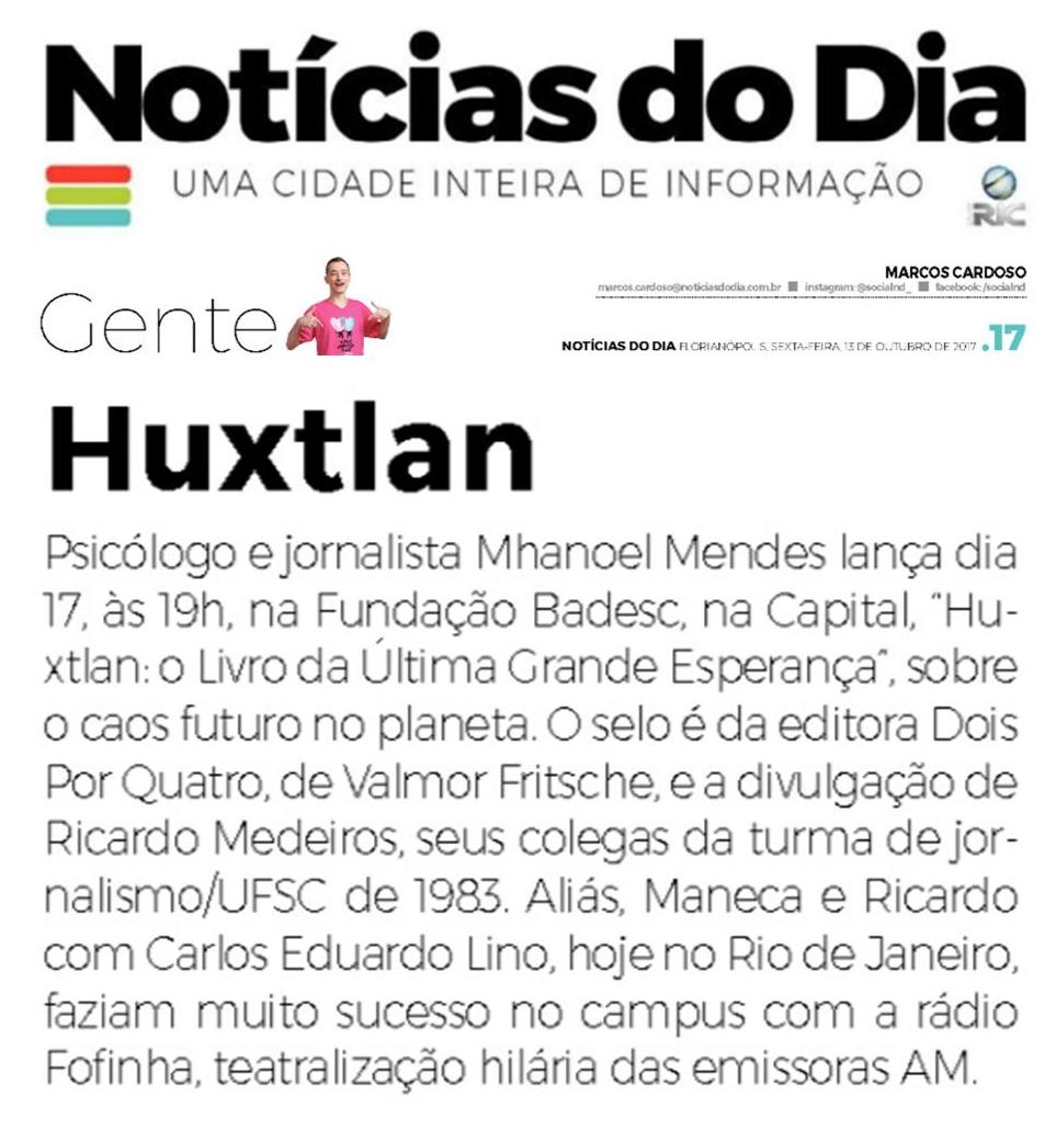 O jornalista Marcos Cardoso, do jornal Notícias do Dia, divulga nota do lançamento do livro Huxtlan: o livro da última grande esperança, do jornalista, psicólogo e peregrino Manhoel Mendes. A obra, que envolve ficção e romance espiritual, é a terceira publicação do autor e narra uma história no ano de 2077, quando o planeta vive um caos. As nações estão em crise, as pessoas estão sem rumo e a inversão de valores torna a humanidade em desumanidade. O lançamento será terça-feira, 17 de outubro, às 19h, na Fundação Cultural Badesc.
