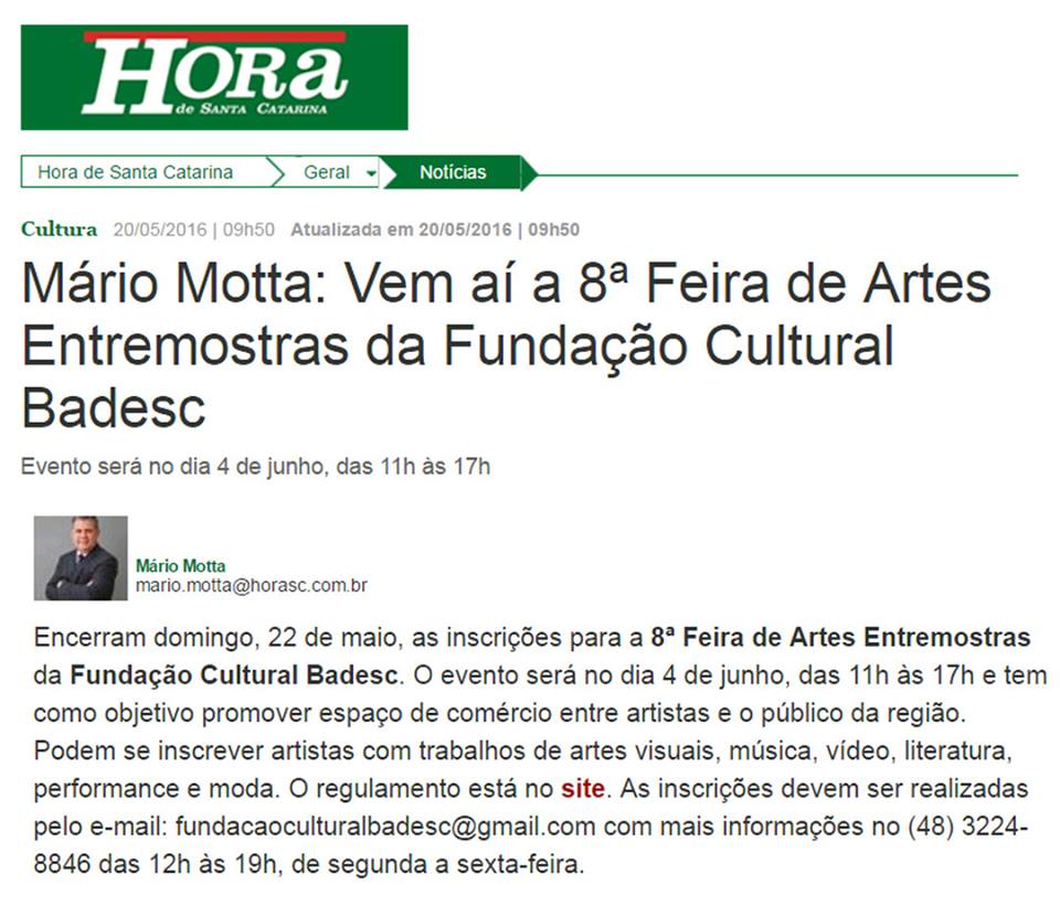 Jornalista Mário Motta, abre espaço em sua coluna no jornal Hora de SC, para falar sobre o prazo final de inscrição da 8ª edição da Feira de Artes Entremostras. O evento será realizado no dia 4 de junho, na Fundação Cultural Badesc.