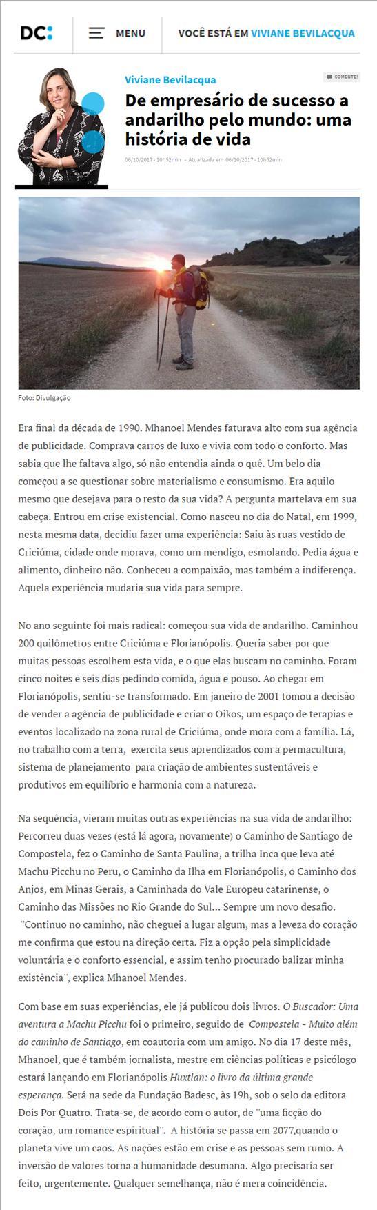O jornalista Rafael Martini, do jornal Diário Catarinense, divulga na coluna VISOR o lançamento do livro Huxtlan: o livro da última grande esperança, do jornalista, psicólogo e peregrino Manhoel Mendes. A obra, que envolve ficção e romance espiritual, é a terceira publicação do autor e narra uma história no ano de 2077, quando o planeta vive um caos. As nações estão em crise, as pessoas estão sem rumo e a inversão de valores torna a humanidade em desumanidade. O lançamento será amanhã, 17 de outubro, às 19h, na Fundação Cultural Badesc.
