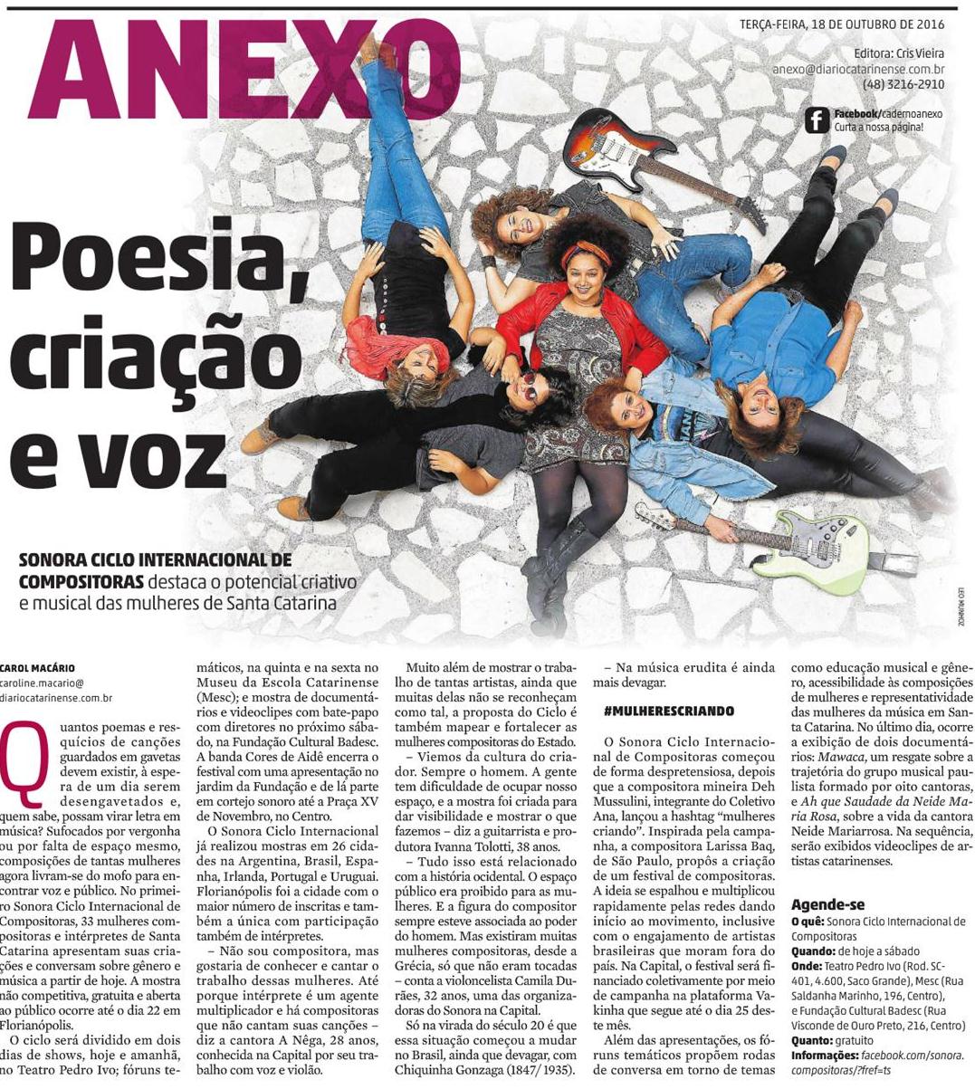 A Mostra Sonora Ciclo Internacional de Compositoras foi capa do Caderno Anexo do Jornal Diário Catarinense. A mostra tem como propósito apresentar a diversidade da música produzida por mulheres no estado e debater a representatividade na cena musical. No sábado, dia 22, a partir das 13h, serão exibidos no Cineclube da Fundação Cultural Badesc documentários e videoclipes, seguidos de bate-papo com diretores, além de apresentação de bandas.