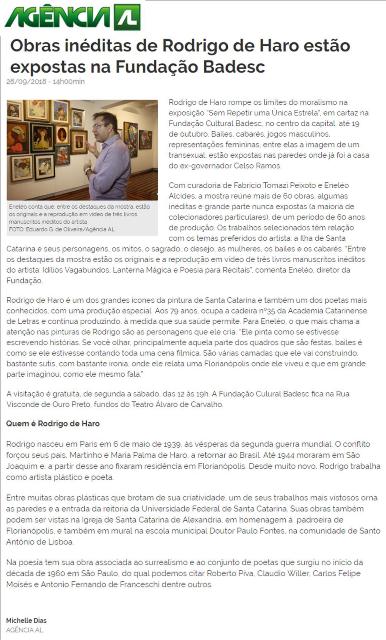A Agência ALESC publicou na sexta-feira, dia 28 de setembro, a reportagem sobre exposição Rodrigo de Haro – Sem Repetir uma Única Estrela, que ocorre no espaço Fernando Beck, na Fundação Cultural Badesc. A visitação pode ser feita até o dia 19 de outubro, de terça a sábado, das 12 às 19h. Entrada franca.