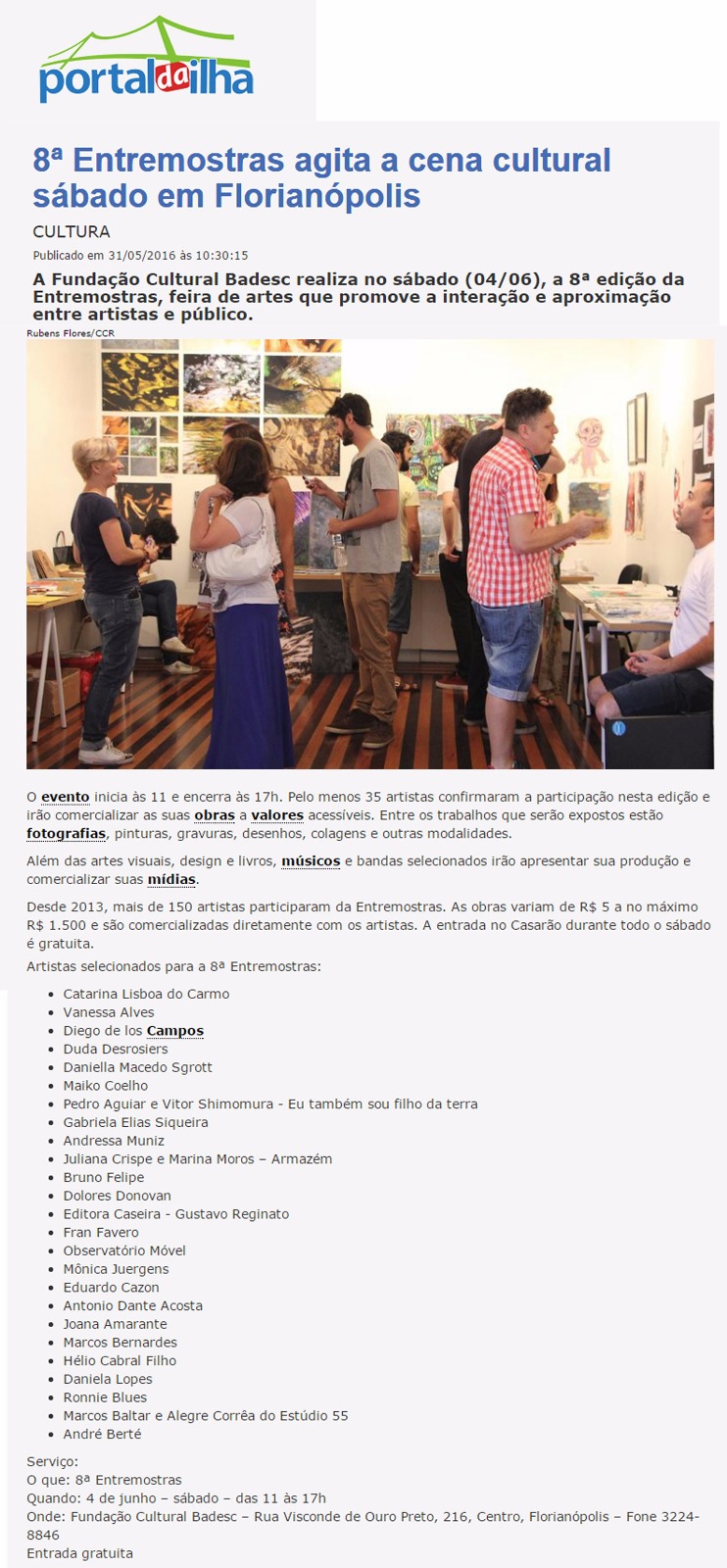 O Portal da Ilha abre espaço para divulgar a 8º Edição da Feira de Artes Entremostras. O evento será realizado neste sábado (04/06), na Fundação Cultural Badesc. Artistas irão interagir com o público e comercializar as suas obras a valores acessíveis. Entre os trabalhos que serão expostos estão fotografias, pinturas, gravuras, desenhos, colagens e outras modalidades. Também haverá apresentações musicais.O evento inicia às 11 e encerra às 17h. A entrada é gratuita
