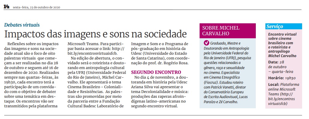 A série de encontros virtuais “A história entre imagens e sons” foi noticiada na edição de terça-feira, 23 de outubro de 2020 do Jornal Notícias do Dia (ND). Os encontros são promovidos através de uma parceria entre a Fundação Cultural BADESC, o Laboratório de Imagem e Som e o Programa de Pós-Graduação em História da Universidade do Estado de Santa Catarina (UDESC), com coordenação do Prof. Dr. Rogério Rosa.