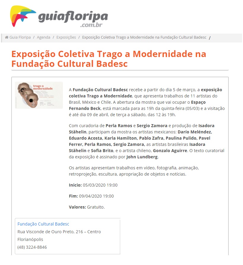 A exposição coletiva Trago a Modernidade, que traz obras de 11 artistas de Brasil, México e Chile, foi destacada na agenda Cultural do site Guia Floripa.