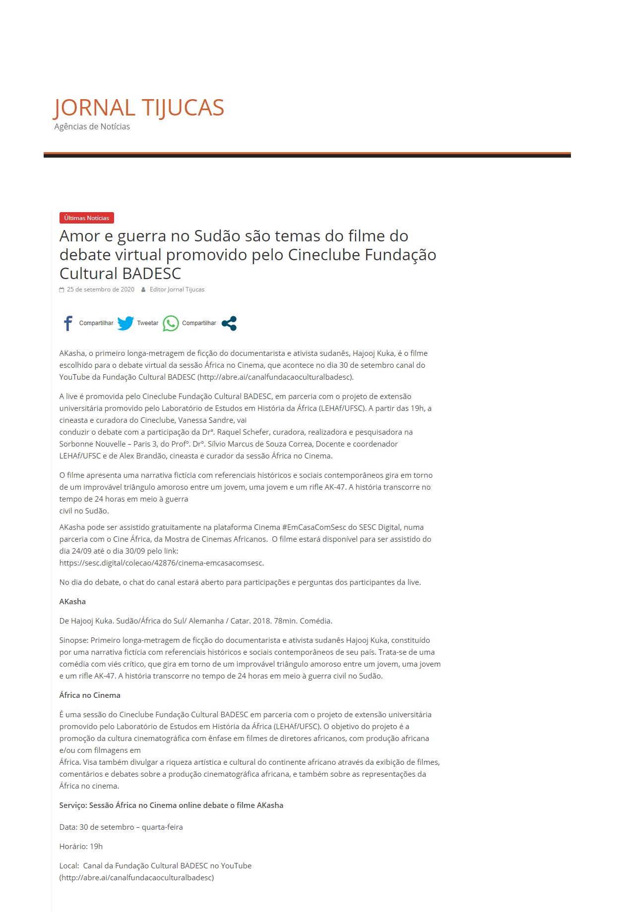 “AKasha”, primeiro longa-metragem de ficção do documentarista e ativista sudanês, Hajooj Kuka, é o filme escolhido para o debate virtual da sessão África no Cinema, realizado no dia 30 de setembro. O evento online foi noticiado no site do Jornal Tijucas.