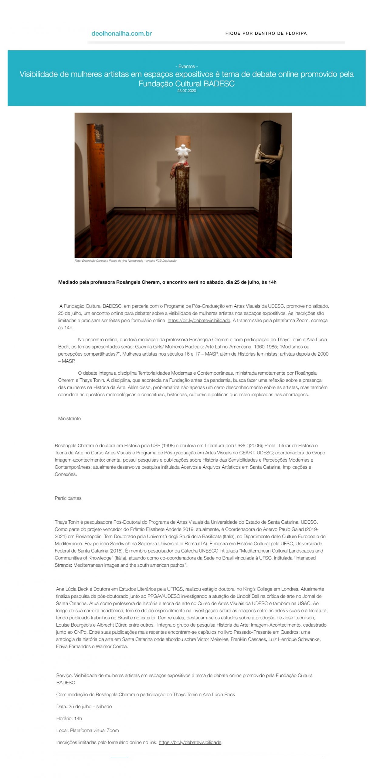 O encontro online promovido pela Fundação Cultural BADESC, em parceria com o Programa de Pós-Graduação em Artes Visuais da UDESC, para debater sobre a visibilidade de mulheres artistas nos espaços expositivos foi divulgado no site De Olho na Ilha.