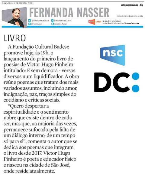 Jornalista Fernanda Nasser, publica no jornal Diário Catarinense, uma nota sobre o lançamento do livro “E sem demora – versos diversos num liquidificador”, de Victor Hugo Pinheiro. O evento acontece nesta quinta-feira (31), às 19h, na Fundação Cultural Badesc. Entrada gratuita