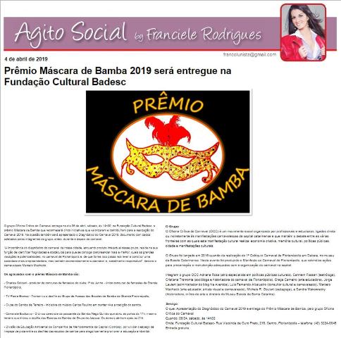 Nesta quinta-feira (4), a colunista Franciele Rodrigues do blog Agito Social, uma matéria sobre a entrega do prêmio Máscara de Bamba. A cerimônia acontece amanhã, 6 de abril, às 14h30, na Fundação Cultural Badesc. Entrada gratuita.