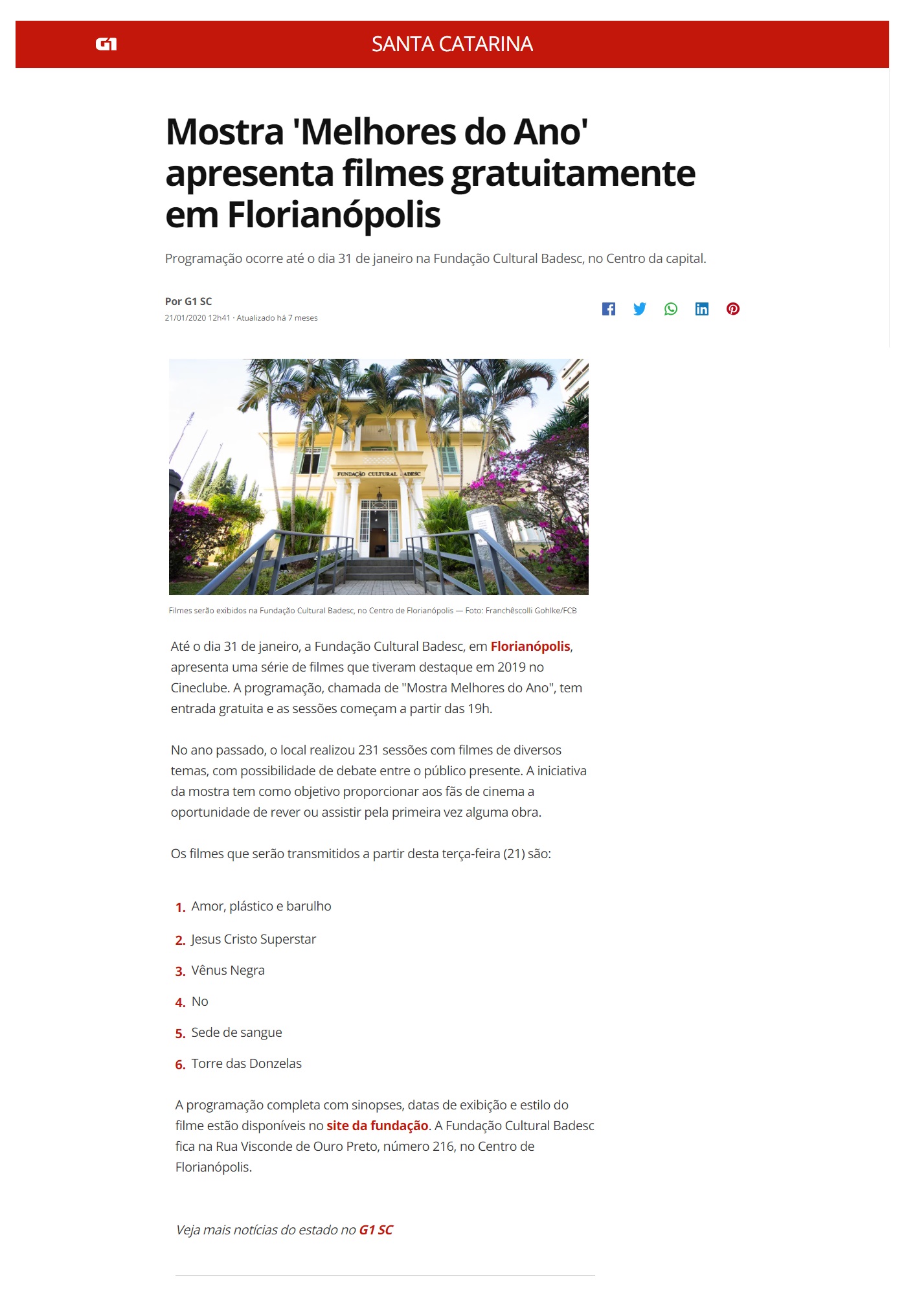A programação da Mostra Melhores do Ano, que resgata os maiores destaques do ano passado no Cineclube da Fundação Cultural BADESC, foi noticiada no site G1 Santa Catarina. A mostra especial conta com seis filmes que foram sucesso de público e críticas que frequentaram as sessões do cineclube em 2019.