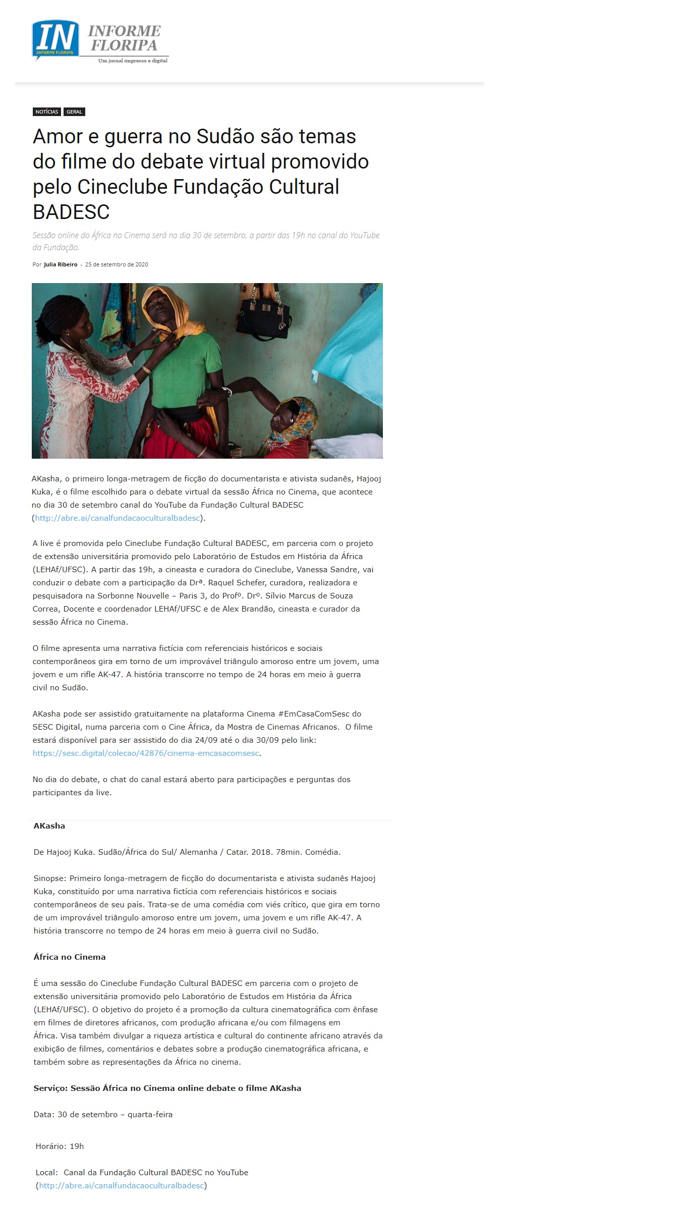 O bate-papo virtual promovido pelo Cineclube Fundação Cultural BADESC através do África no Cinema, para tratar sobre o filme “AKasha”, foi destacado pelo site Informe Floripa.
